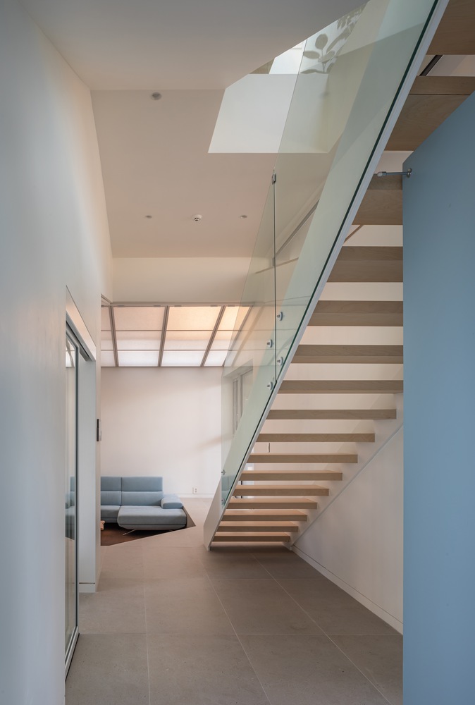 The horizontal windows placed along the stairs between the first and second floors instantly expand the view to the backyard and beyond the boundary of the house and make the monotonous vertical movement more enjoyable.