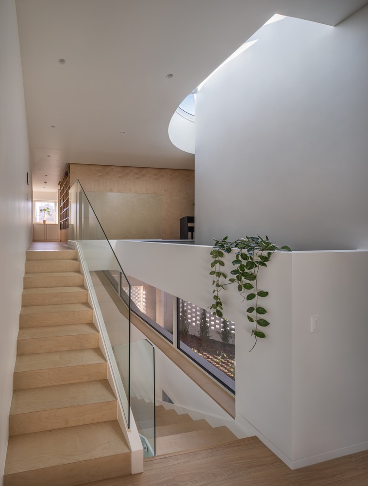 The skylight window of the curved wall on the second floor lets in gentle natural light to illuminate the indoor landscape, and shadows cast by the sun trace across the wall, capturing the passage of time.