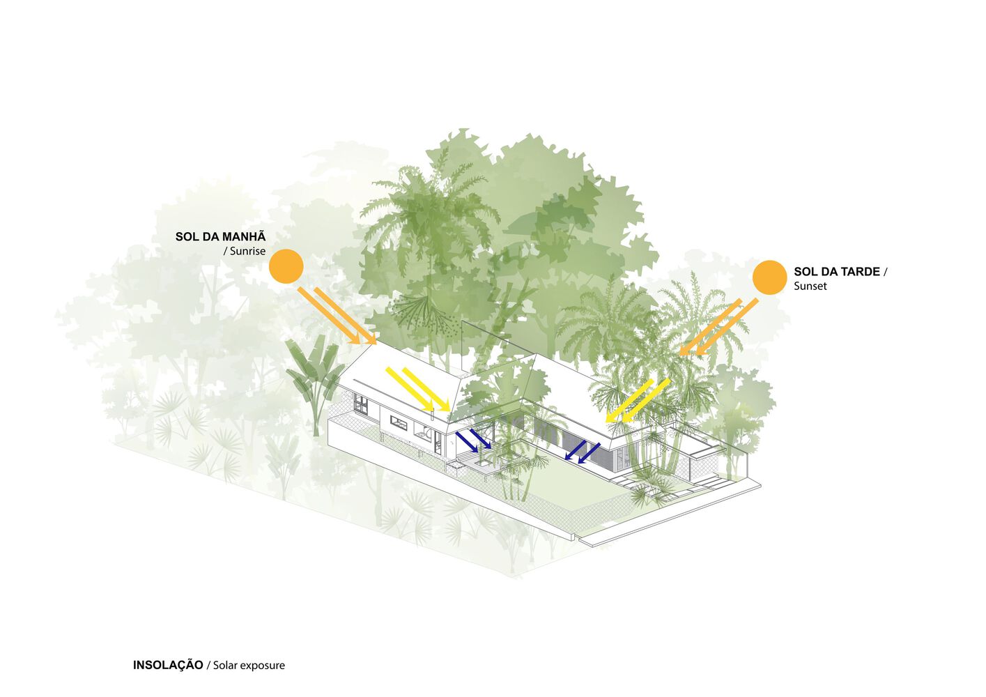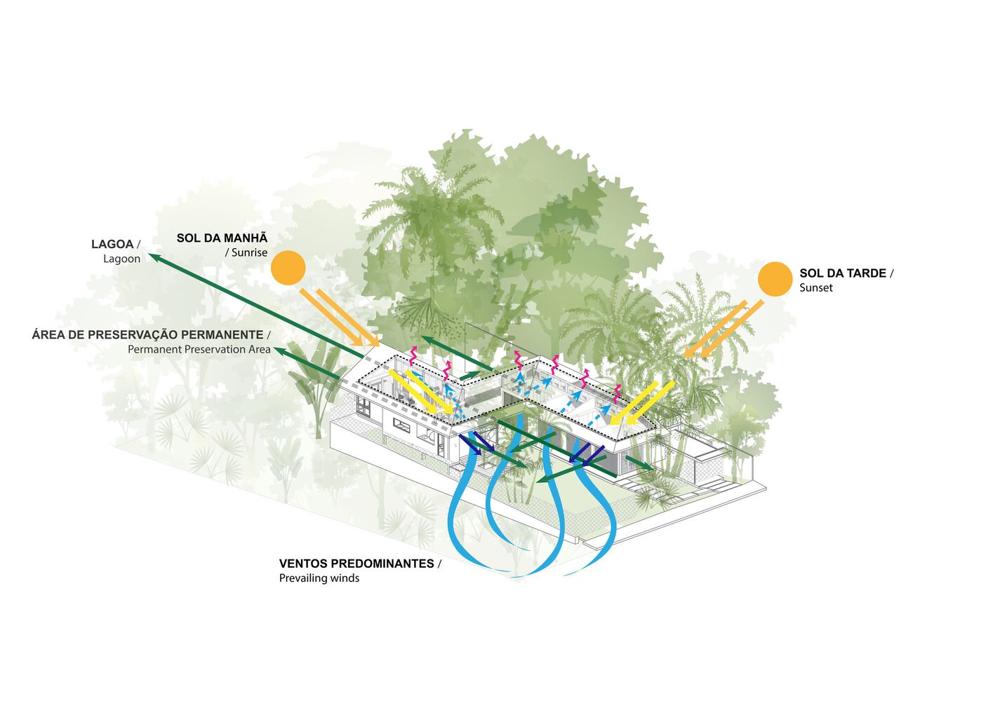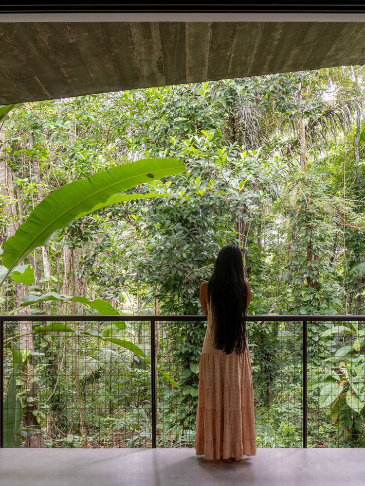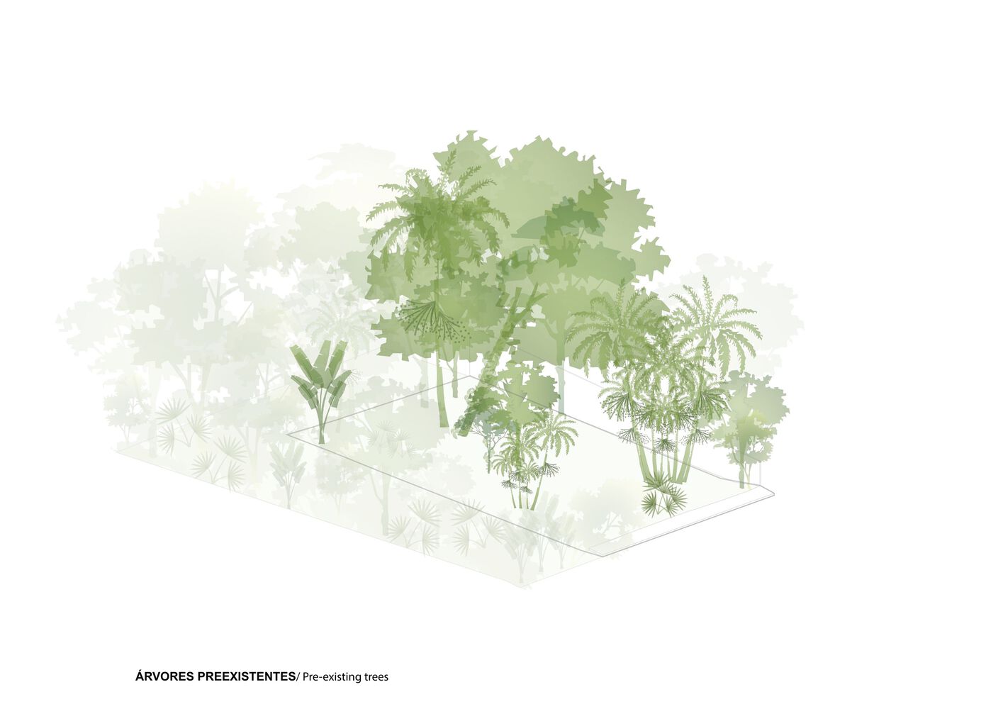 Located on a plot of land with sides and a back facing an environmental protection area, Casa Cajuí is nestled among several existing trees to take advantage of their shade and the cross views between the external green areas and the preserved areas on the lot.