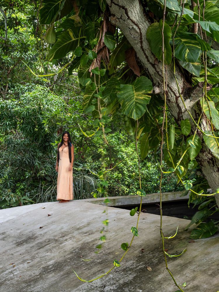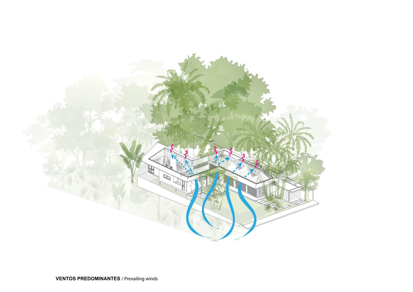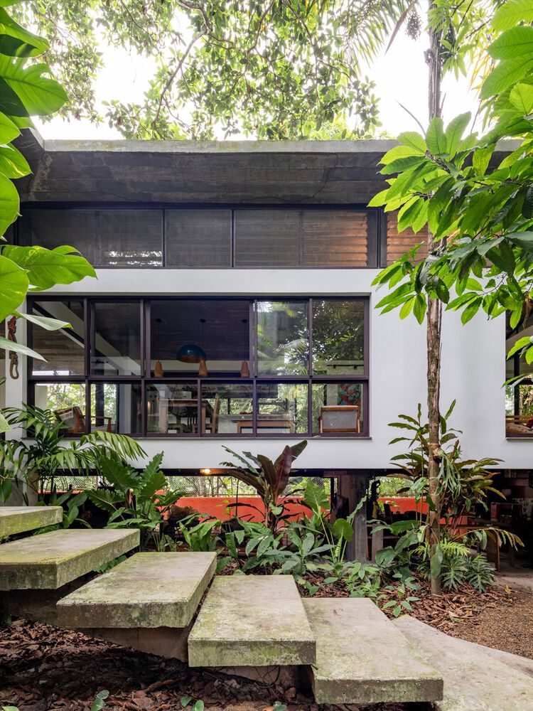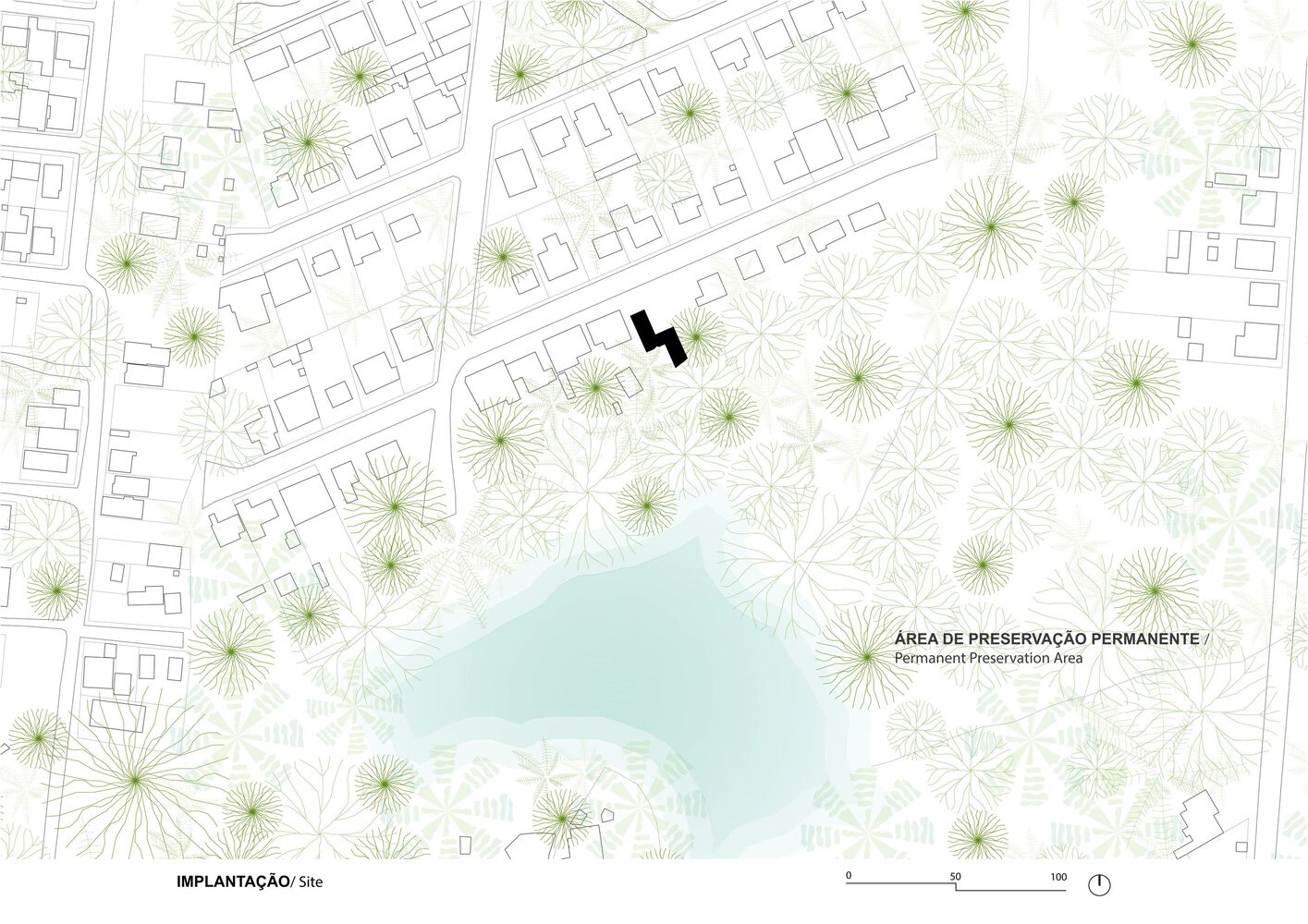 Located on a plot of land with sides and a back facing an environmental protection area, Casa Cajuí is nestled among several existing trees to take advantage of their shade and the cross views between the external green areas and the preserved areas on the lot.