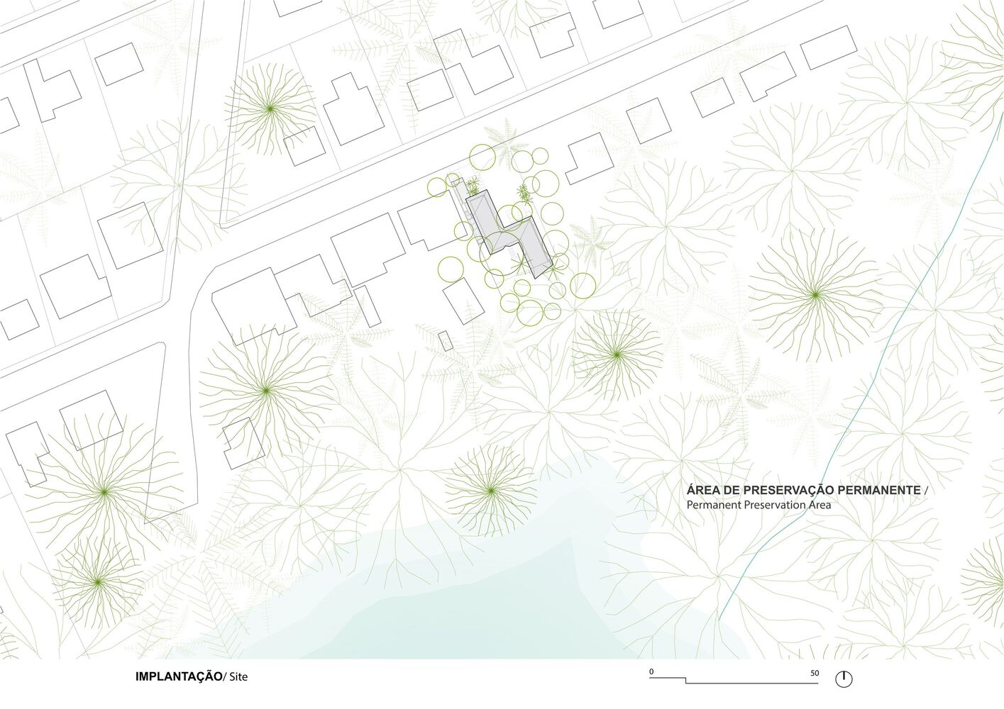 The shape of the house was defined by the natural preexistences and allowed for the exploration of a different typology, as the intimate block and offices are in the foreground, close to the street, while the social block is at the back of the lot, slightly elevated to function as a lookout over the green area at the back, while the covered outdoor living space becomes the central space of the house.