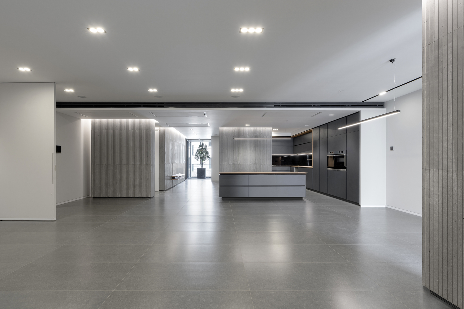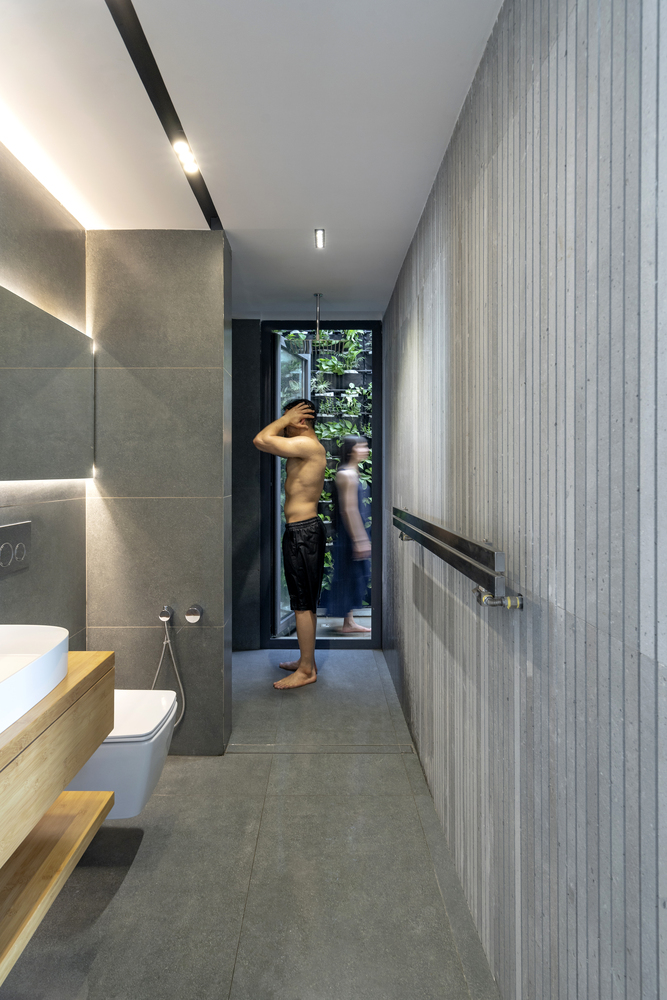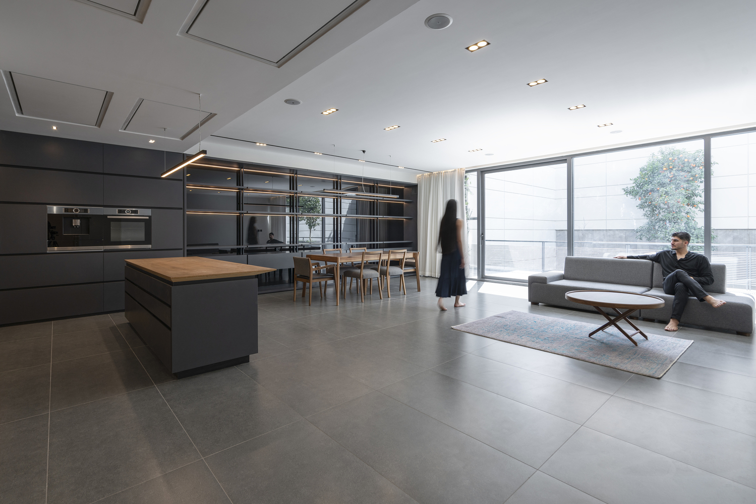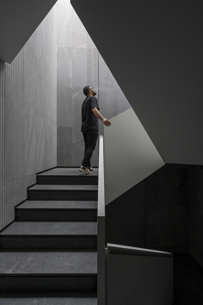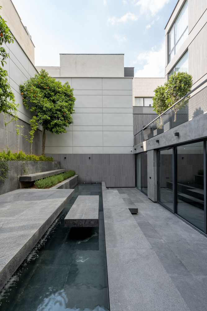 In the interior spaces, furniture, materials of closets, and cabinets are made of Elm wood to create a warm atmosphere alongside the cold and neutral color of Basalt stone.