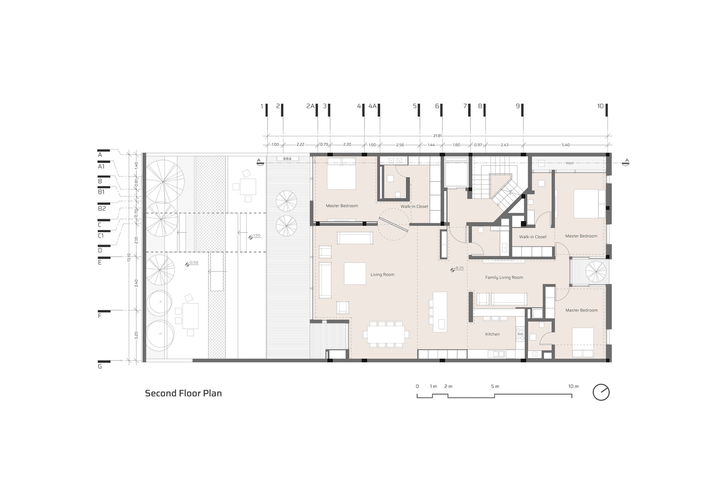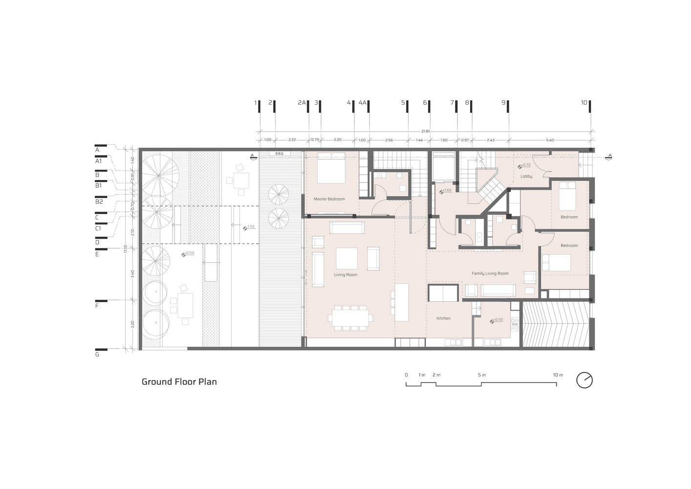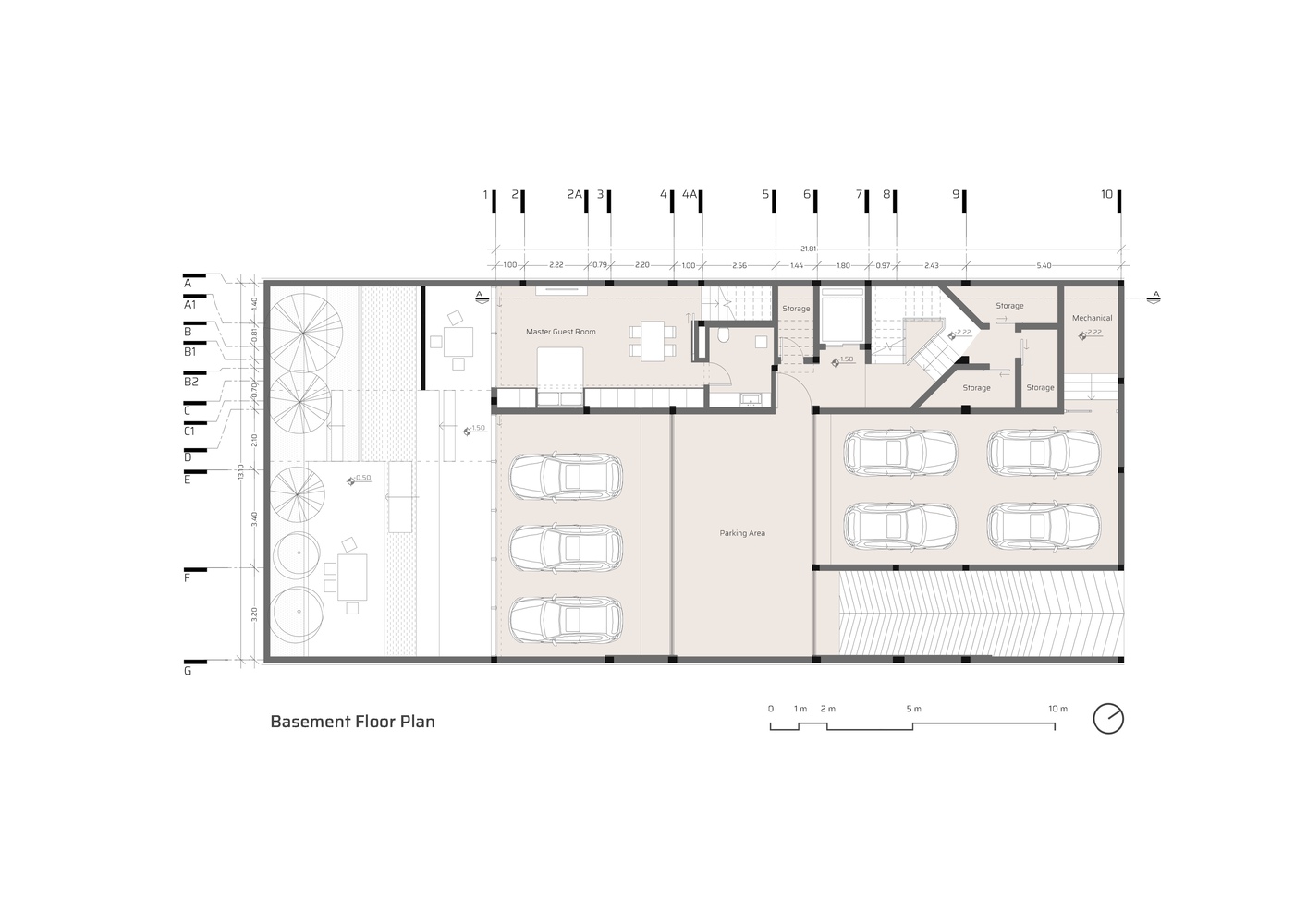 In the interior spaces, furniture, materials of closets, and cabinets are made of Elm wood to create a warm atmosphere alongside the cold and neutral color of Basalt stone.
