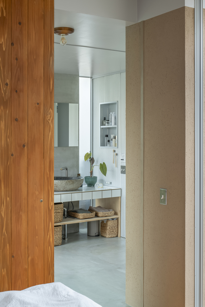 Textures were sampled from his parents' studio, the texture of the adjacent school building, the apartment he lived in as a student, and the streets of his home country, where he spent his childhood, and were used as materials to make up the house.