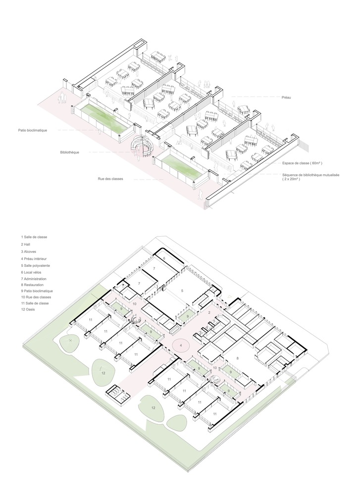 Split in two by the interior play area, each part of the axis is embellished with four classrooms and patios.