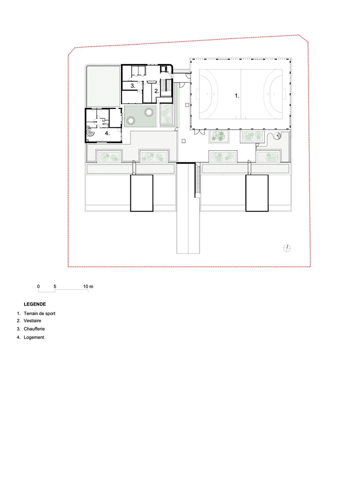 The roof of the sporting area is equipped with photovoltaic panels producing more energy than the building consumes.