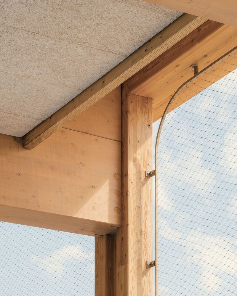 Between the classrooms, mudbricks are added to the wooden structure, increasing the visibility of natural and bio-sourced materials in the building's construction.