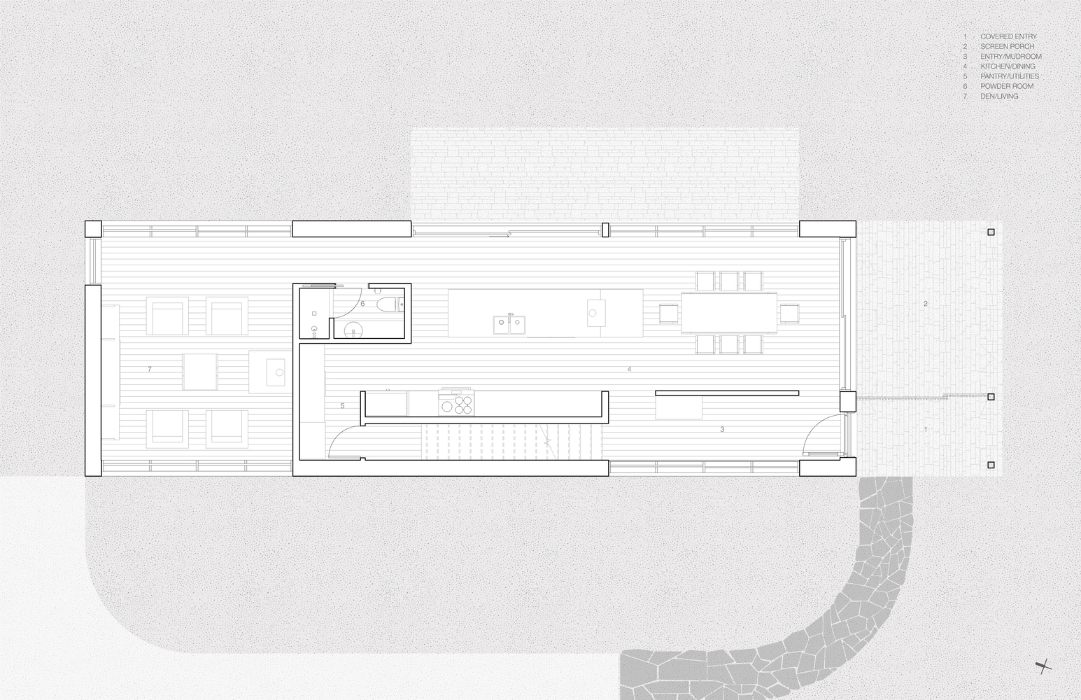 The 2,520-square-foot house was designed as a year-round retreat for a large extended family. To maximize the use of available footprint—the home sits within a conservation easement and the buildable footprint was severely limited—a two-story porch was designed on one end of the building volume to provide several overlapping features including a sheltered entry, a screen porch that expands interior living spaces, and an upstairs sleeping porch all within one simple architectural move.