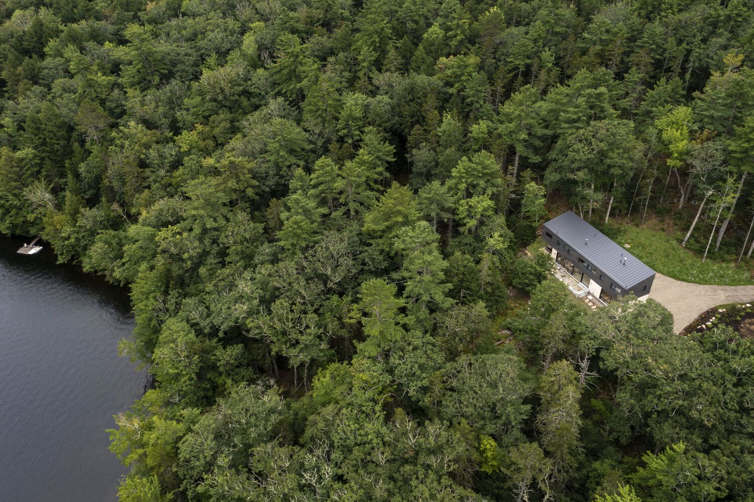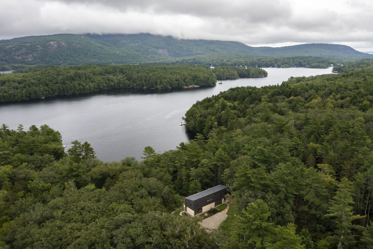 Perched atop a wooded slope, The Roost residence overlooks one of Maine's lakes with filtered views of nearby mountains.