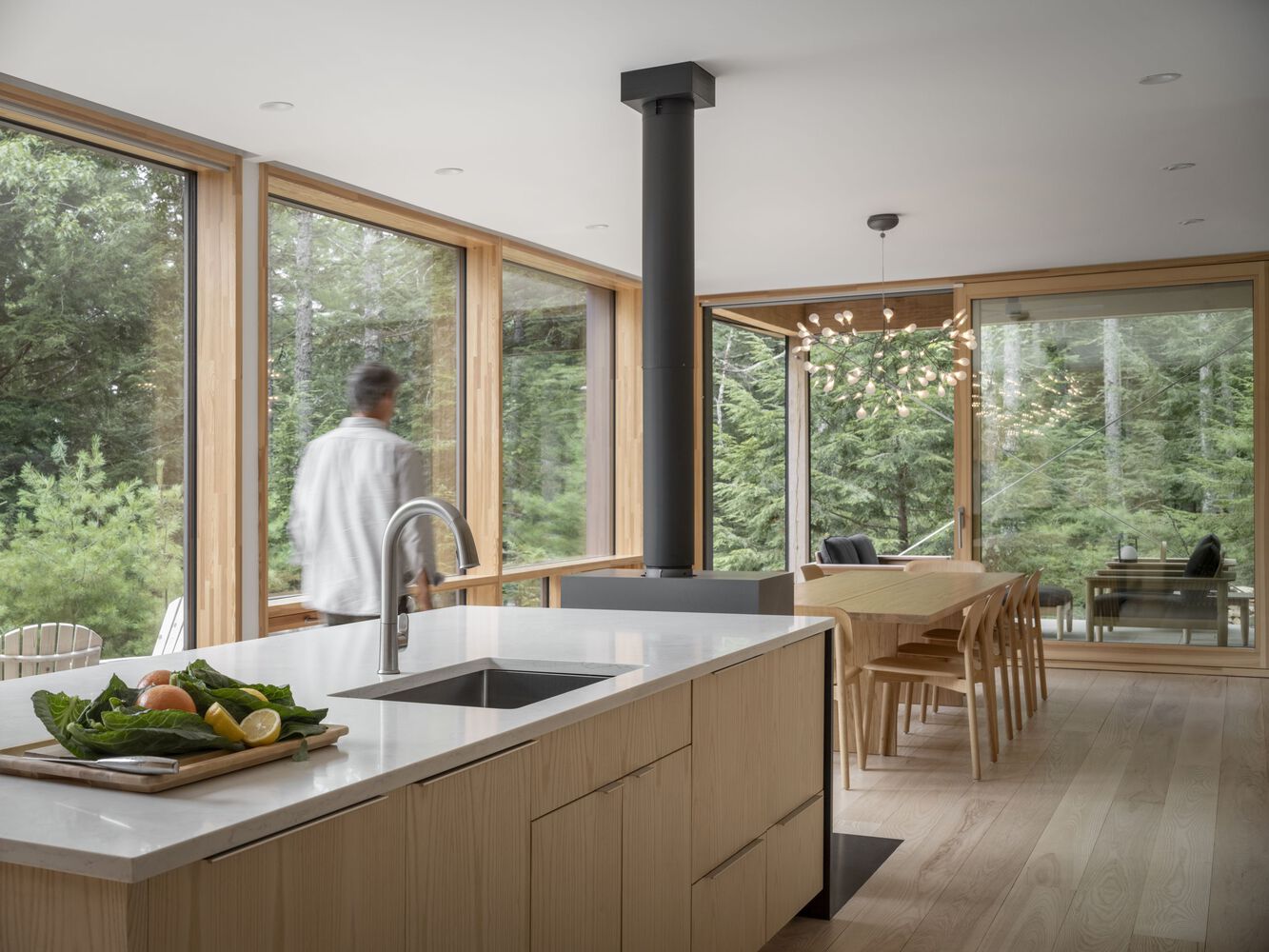 Large areas of glass allow the slightly elevated living spaces to feel part of the surrounding woods.