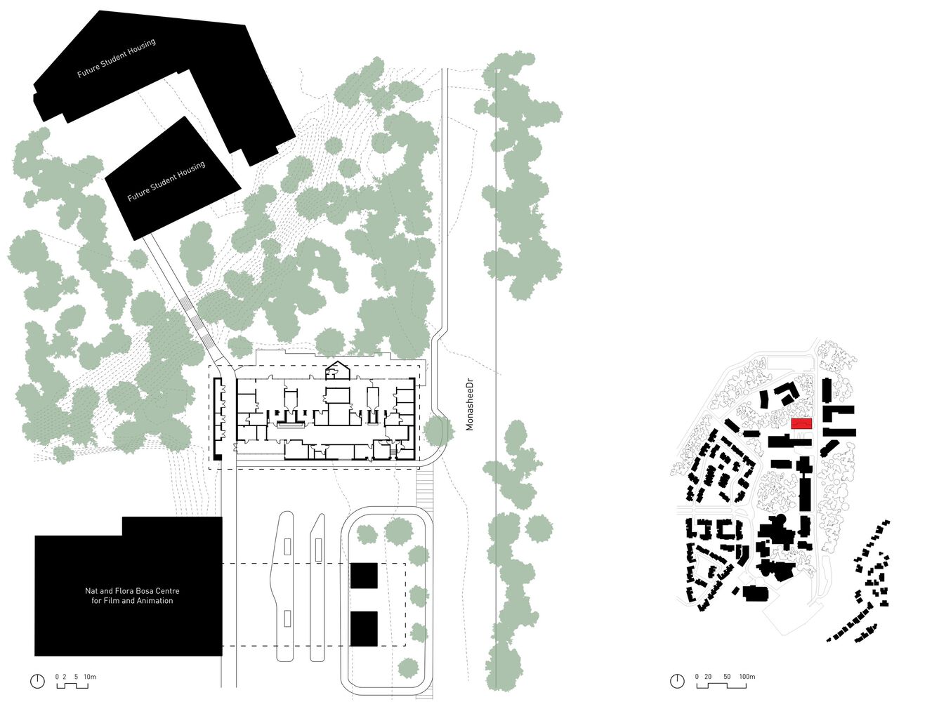 On the second floor, the ECCE teaching spaces continue this connection through continuous glazing, allowing views of the tree canopy through the skylight monitor above the Strada.