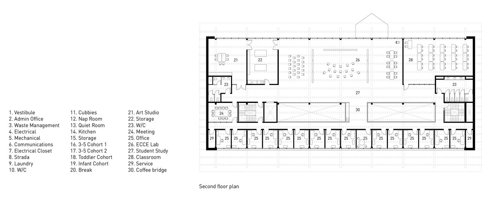On the second floor, the Strada connects to ECCE teaching and faculty spaces. Open to the level below and naturally lit from above, it creates visual and auditory links between educators and the child care environment, enriching opportunities for experiential learning.
