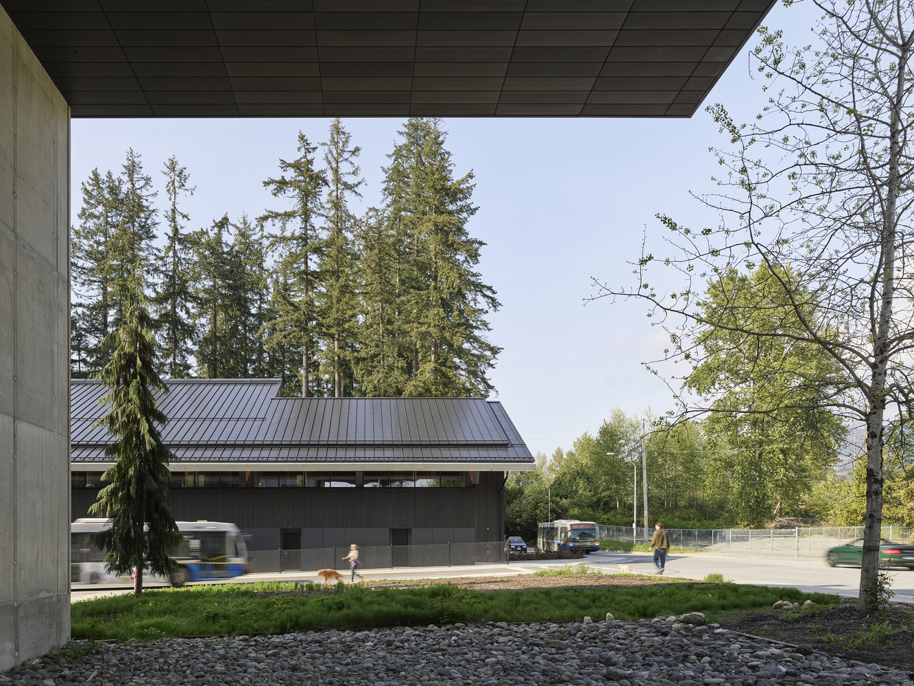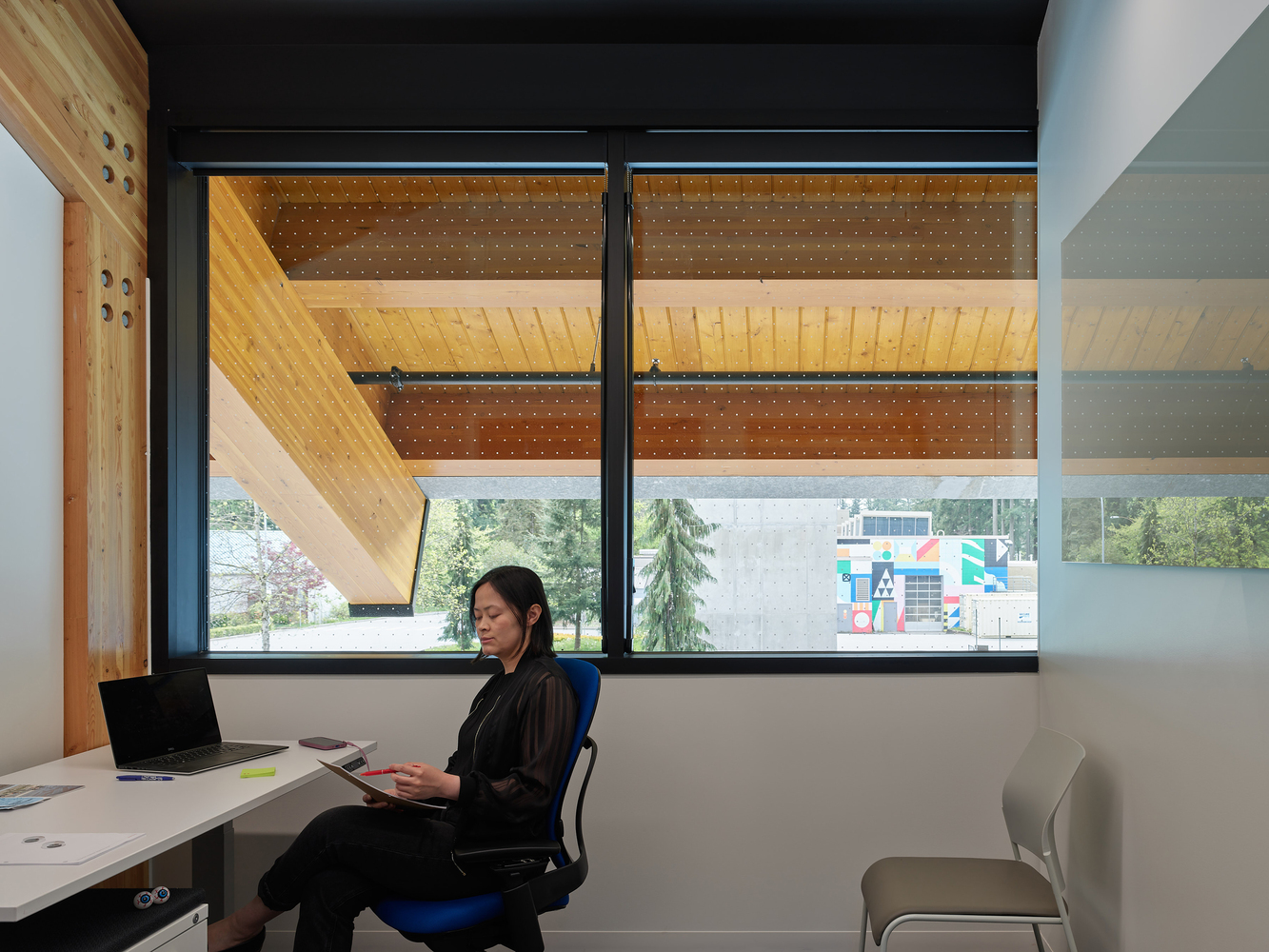 Generous timber overhangs drop steeply to the south to shade office windows and extend broadly northward to shelter outdoor areas from the North Shore rain.