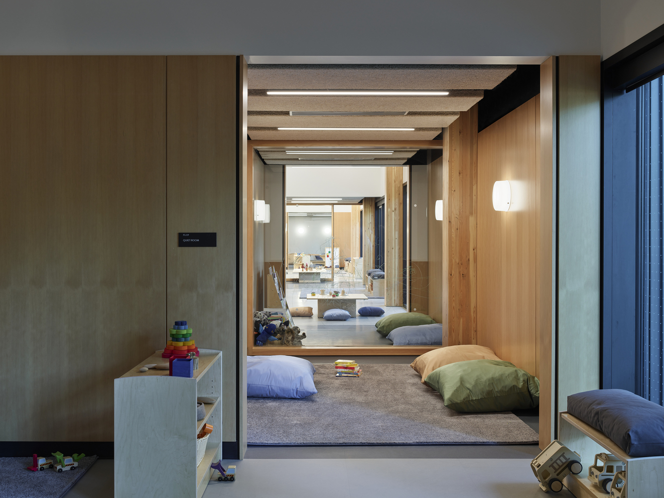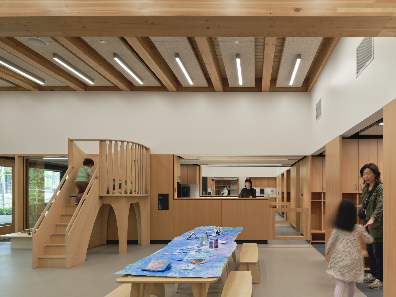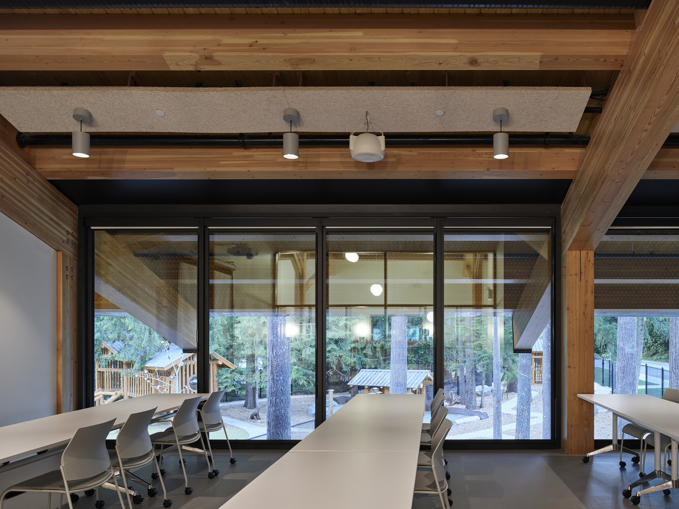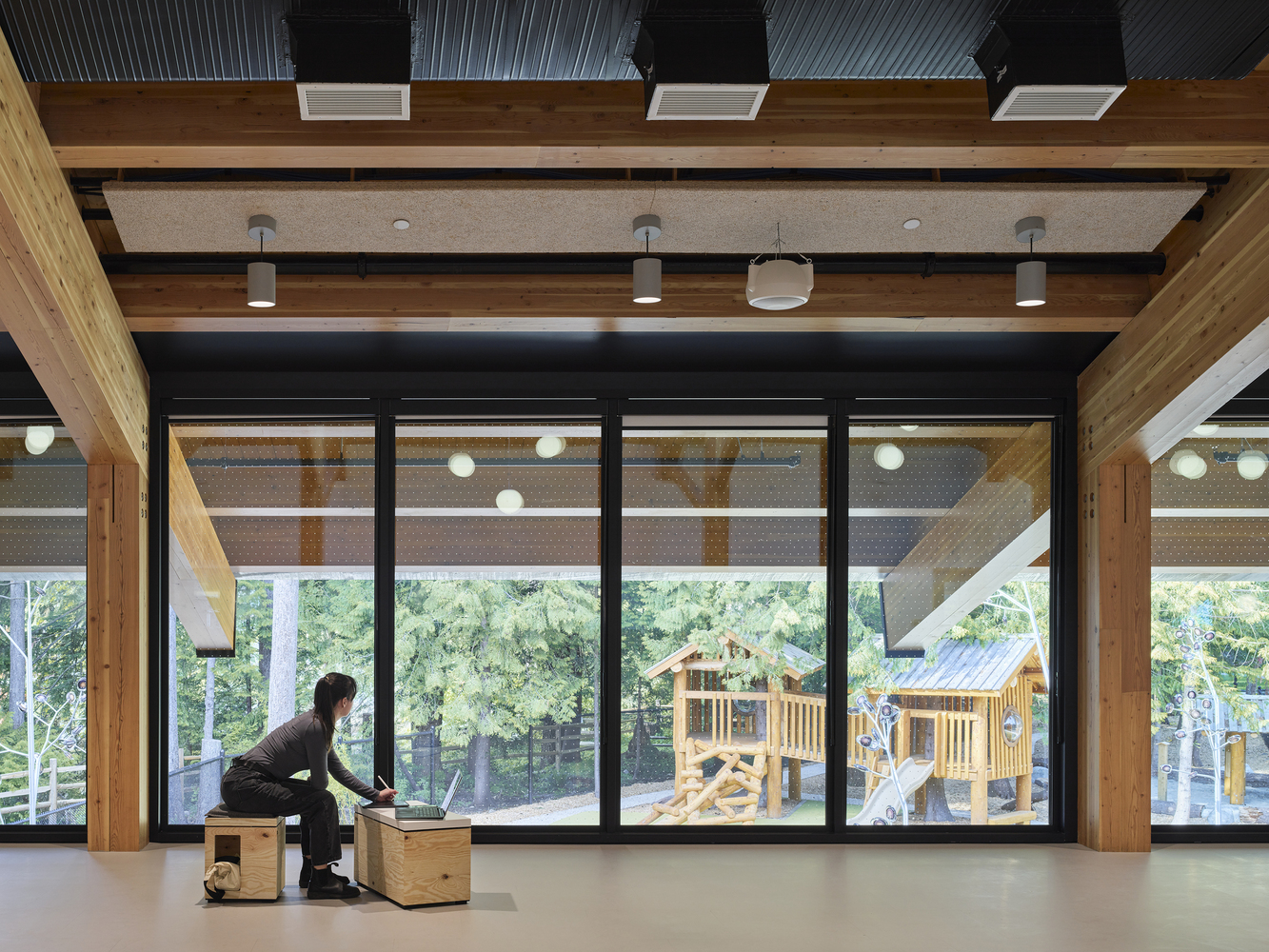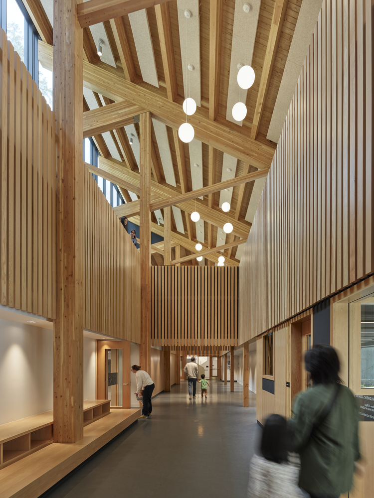 Similarly, Douglas Fir panels and millwork line the child care spaces, providing durable wall protection while visually connecting interior and exterior play areas.