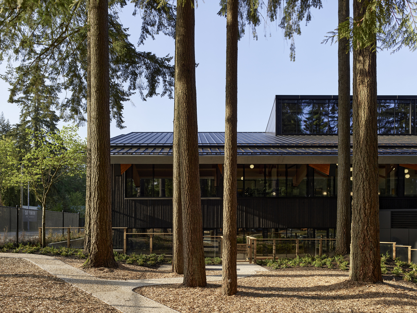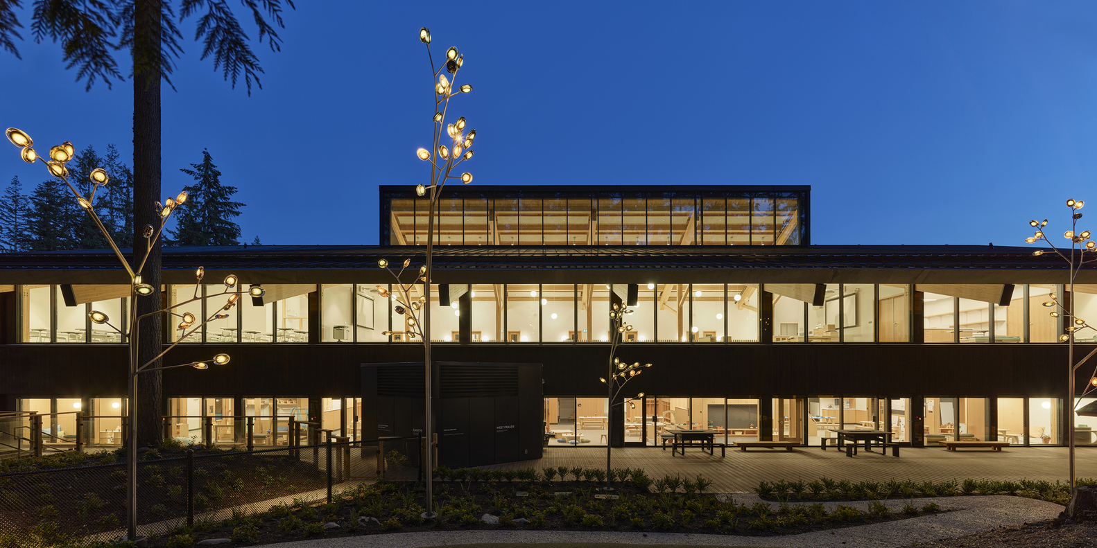 The building showcases wood at every turn. At its center, Douglas Fir glulam dendritic columns branch out like trees, rising to the clerestory glazing and framing views of the treetops.