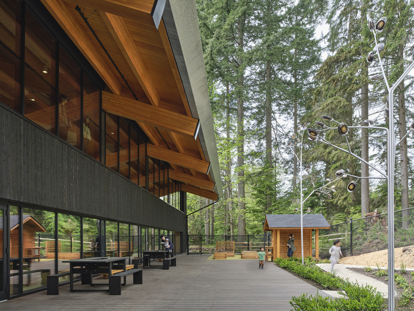 Set within a forested landscape, the building integrates seamlessly with its natural surroundings. The mature forest to the north is preserved as an outdoor play area, featuring small structures built from site-cleared natural materials.