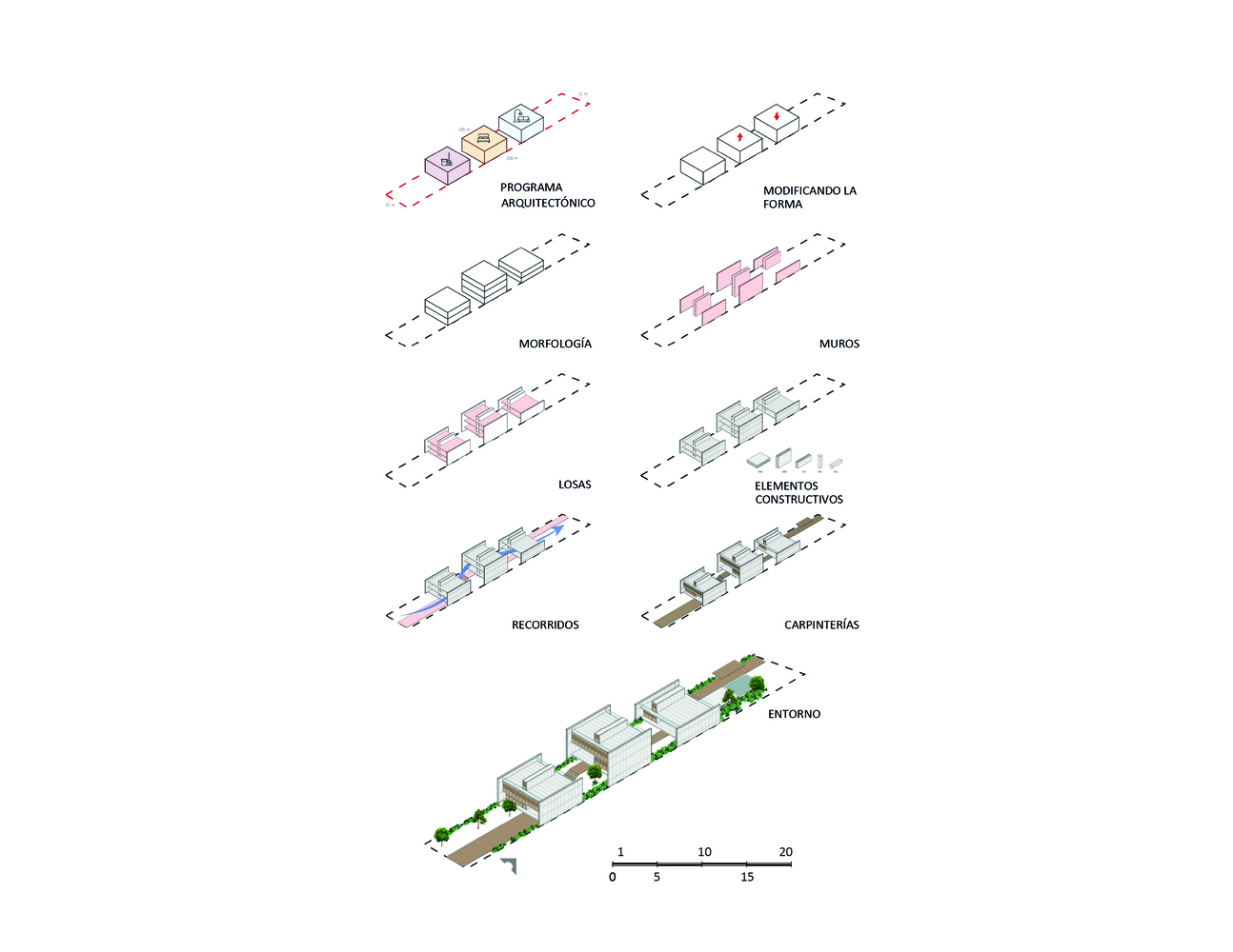 The construction innovation lies in the implementation of hollow core slabs that were originally designed for roofing, using them also to form the load-bearing walls, which with the same section of 1.21m wide x 0.20m thick, solves the entire structure, and this was achieved thanks to the modular design that shapes the building.