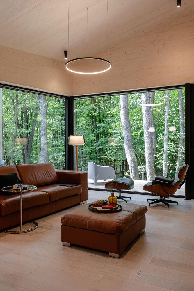 The 31.2 m² covered and 17.6 m² open terrace wraps around the building, connecting the interior space naturally with the surrounding forest.