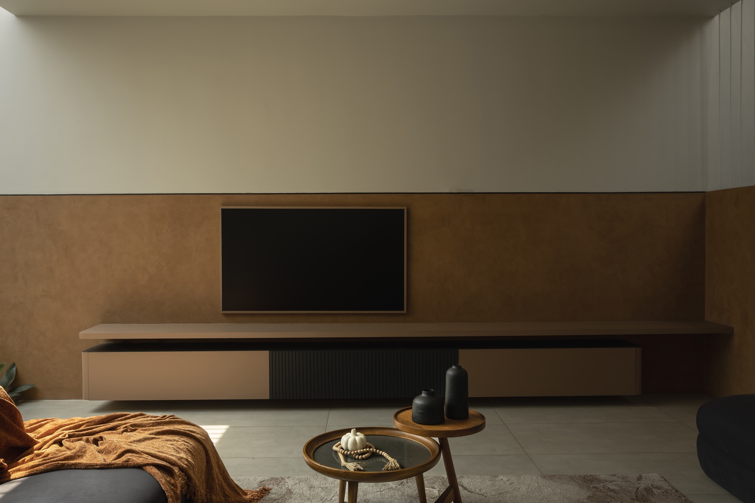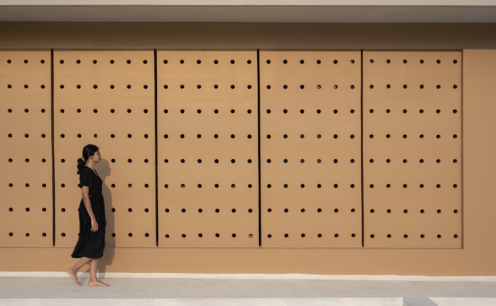 A warm monochromatic composition with subtle contrast between matte walls and polished wooden elements. Smooth, plastered surfaces finished in warm ochre with a matte texture, punctured with circular perforations that define the visual rhythm of the facade.