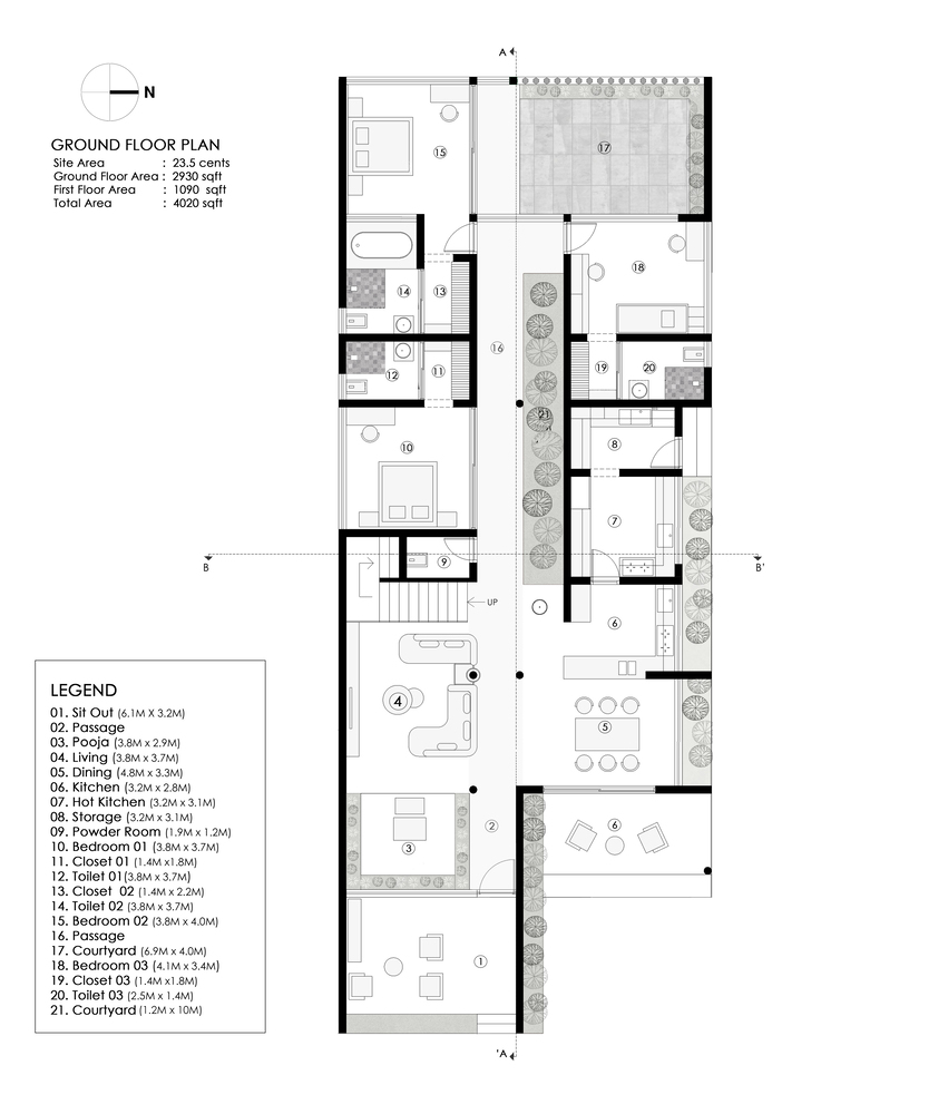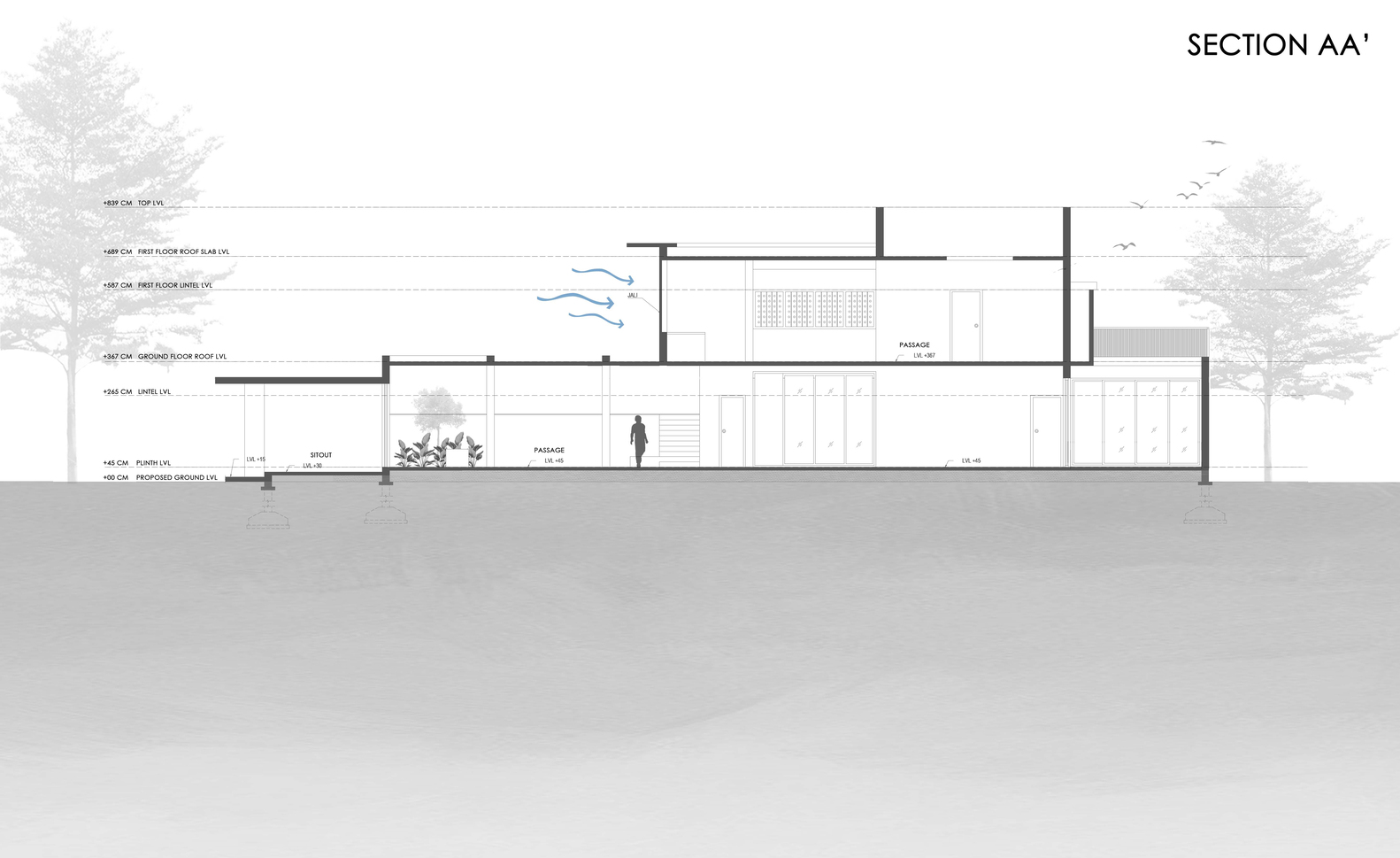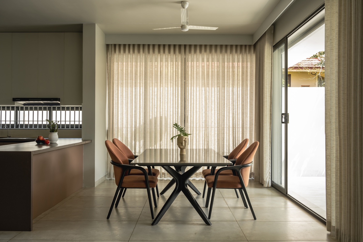 As the corridor continues, it gently opens up to two bedrooms, each oriented towards green voids for privacy and ventilation.