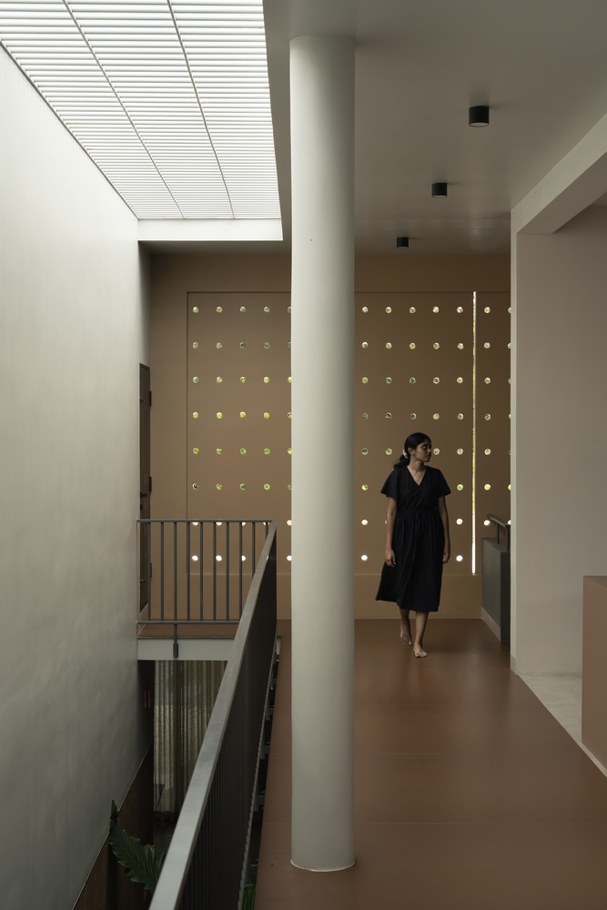 Textured finishes, muted tones, and clean lines dominate the composition, allowing the play of light to animate the surfaces throughout the day. The perforated walls cast moving shadows that change with time, giving the architecture a living quality.