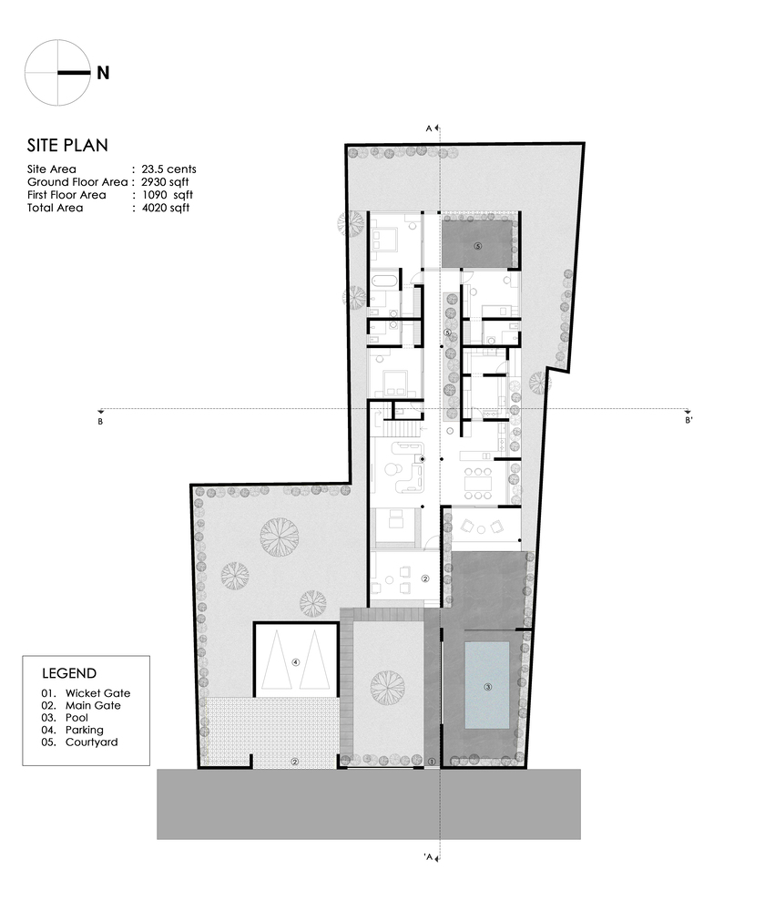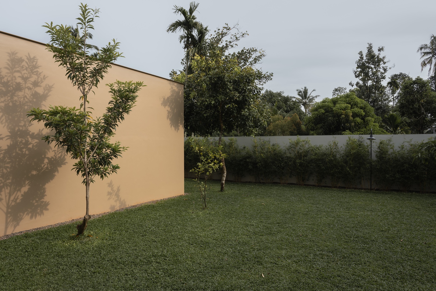 The design took root in the idea of protection. As the site lay open to the busy road, a strong sense of enclosure became essential. A long, bold wall was raised along the front edge of the property, standing as both shield and sculpture.
