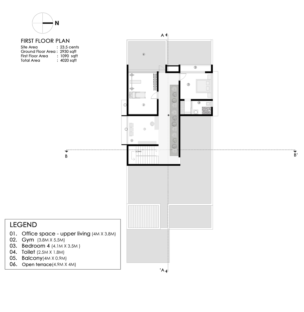 The first floor houses a compact gymnasium and a bedroom, continuing the same sense of balance and openness found below.