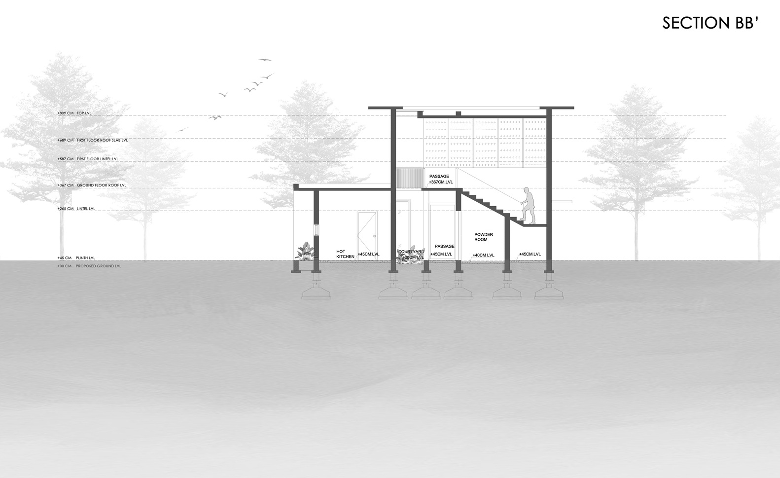 On the right side of the corridor unfolds a cluster of functional spaces: the dining area, kitchen, working kitchen, and utility, each arranged for comfort and efficiency. The dining area extends towards the landscape, bringing in natural light while maintaining enclosure.
