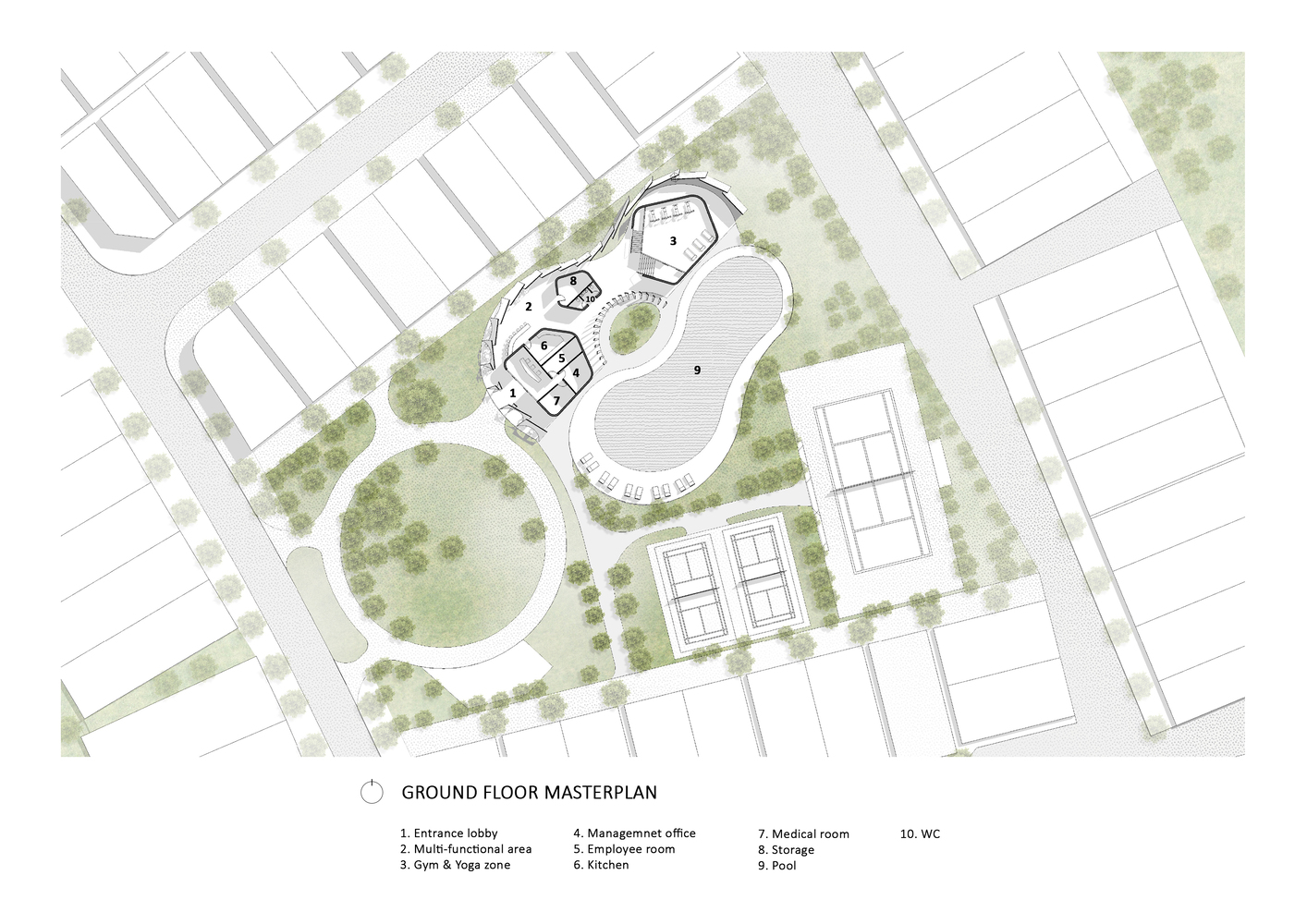 This 8m high structure is not a standard clubhouse, but a giant seashell or an architectural flow coiling around the swimming pool.