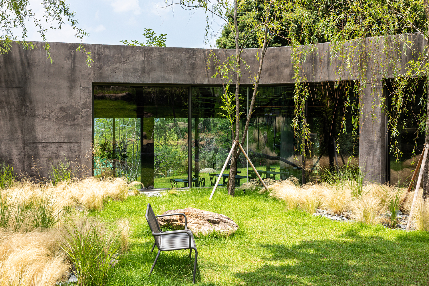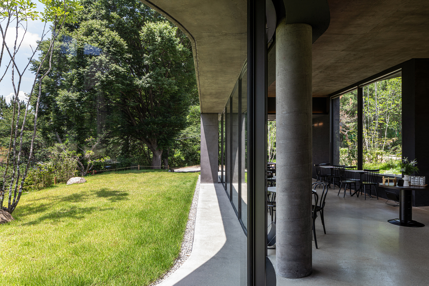 As you walk along the slope, the garden below gradually rises to eye level. It offers a closer and more intimate experience of the forest. The interior is compact, but it feels protected and cozy.