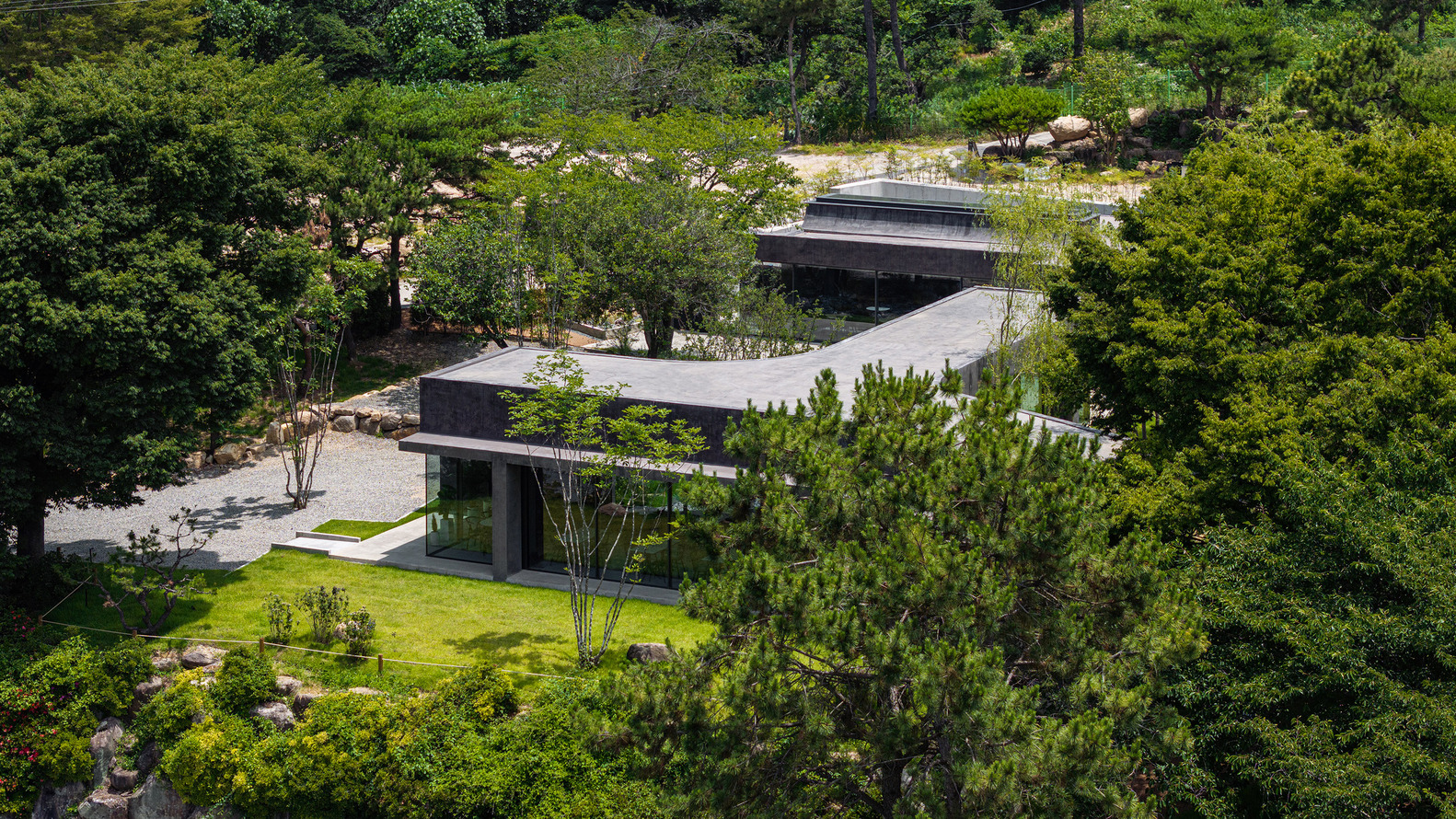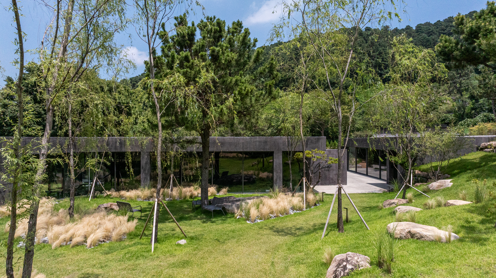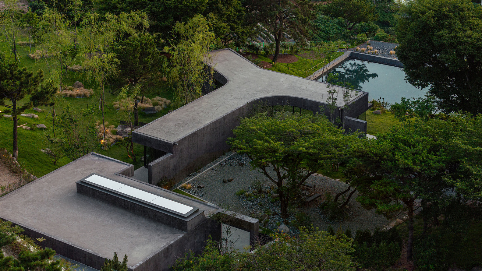 Wall, column, floor, and roof. Only these four elements were used. A long wall was built along the slope. It divides the land and gives scale to the wide, open site. On one side, a clean courtyard greets visitors.