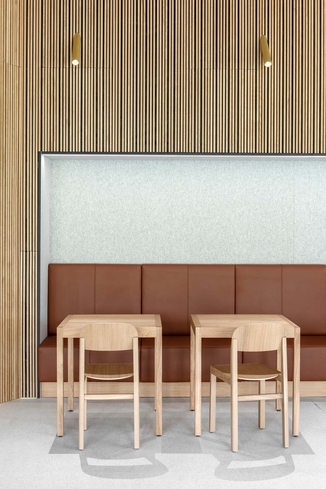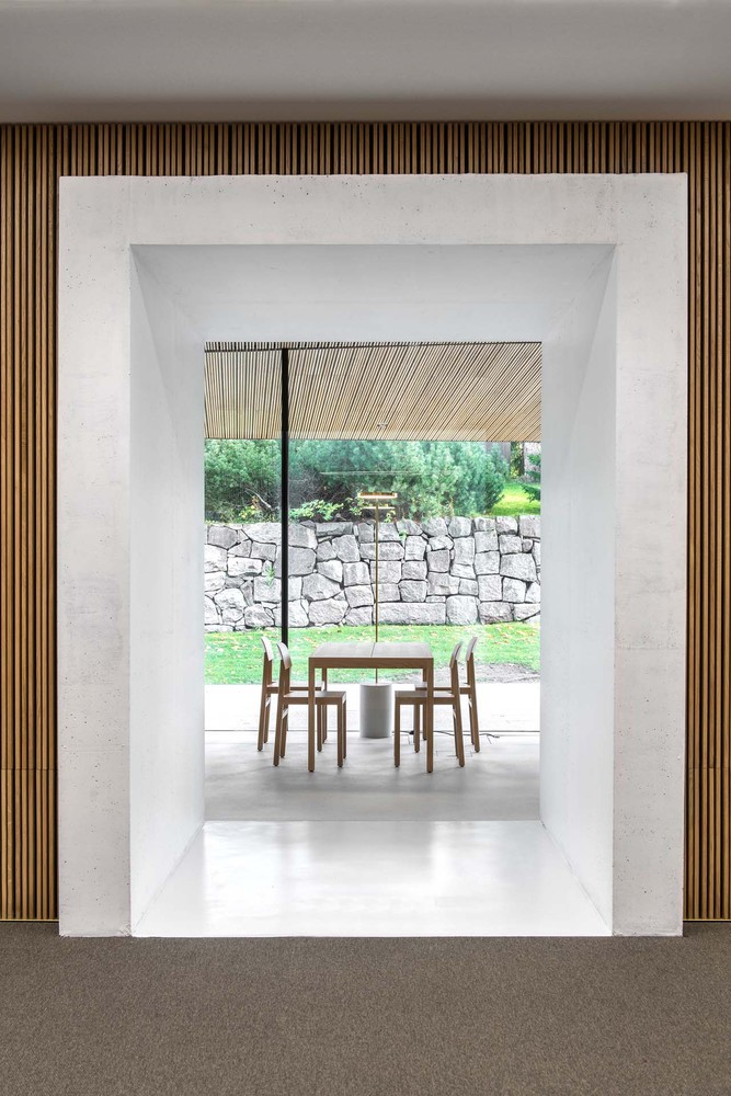 As in other JKMM, projects the interiors team have emphasised the role of fitted furniture in continuing the architectonic qualities of the building form. Slatted timber walls and ceilings also feature in a way that blurs the division between the hand of architect and that of the interior designer.
