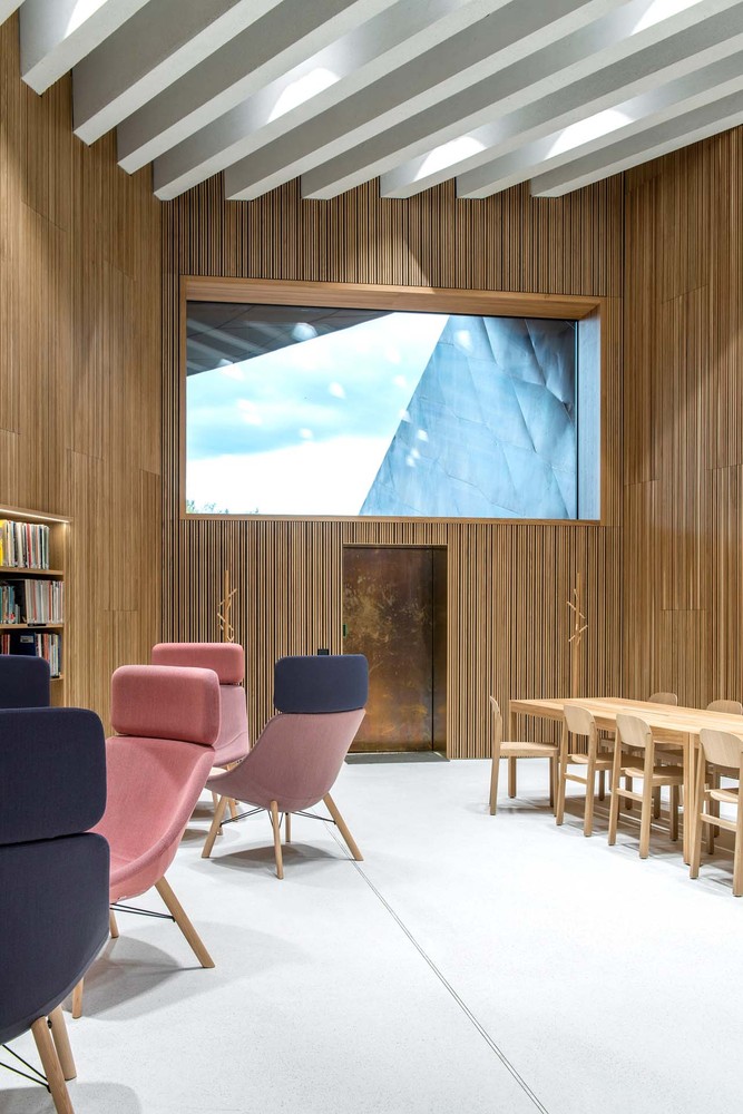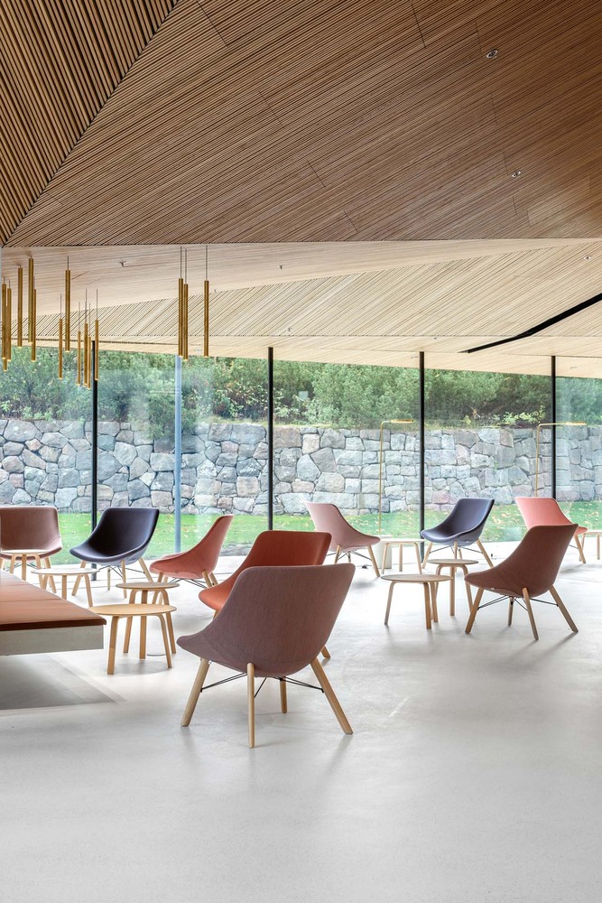For example, JKMM's interior design team has played on local nature in their choice of subdued colours and of materials like wool and felt upholstering, and have worked with Finnish artist Petri Vainio to create an in-situ art piece in the ceiling of the main entrance lobby that represents a bed of reeds.