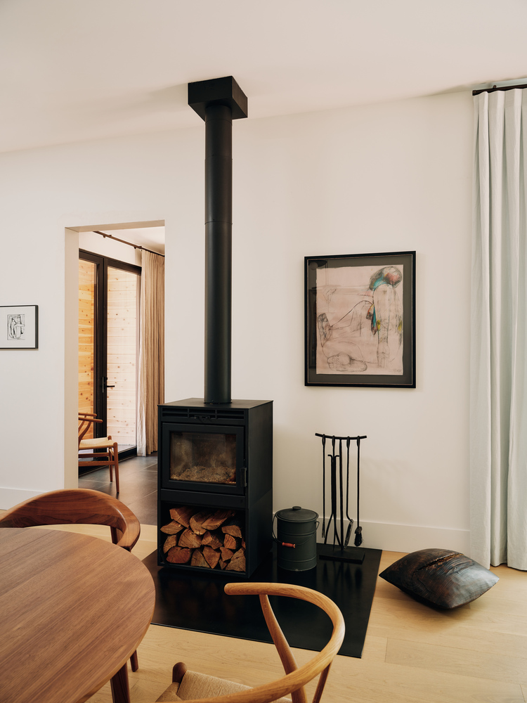 The property includes two all-electric homes with solar and battery systems; efficient wood stoves and passive house strategies ensure sustainability, while HRVs maintain indoor air quality.