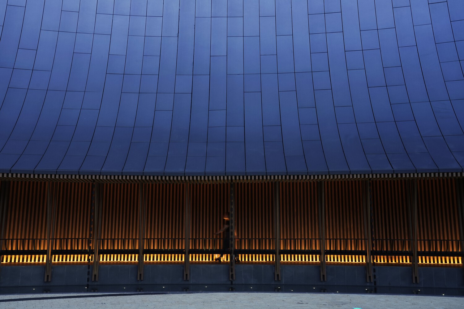 Rather than covering the building in traditional motifs, we introduced The Curtain—a concept that works both visually and metaphorically. Two curved, curtain-like aluminum panels gently mask the original form, creating a light, open impression.