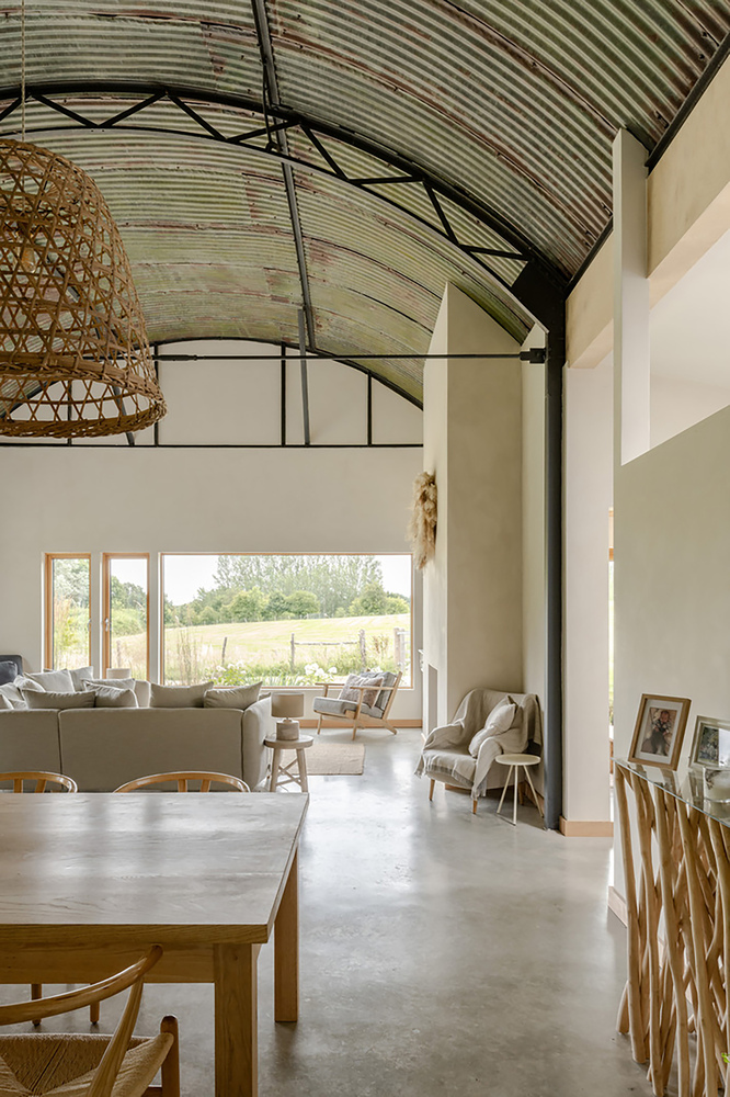 The original steel frame and curved corrugated roof are retained and expressed internally, preserving the barn's volumetric clarity.
