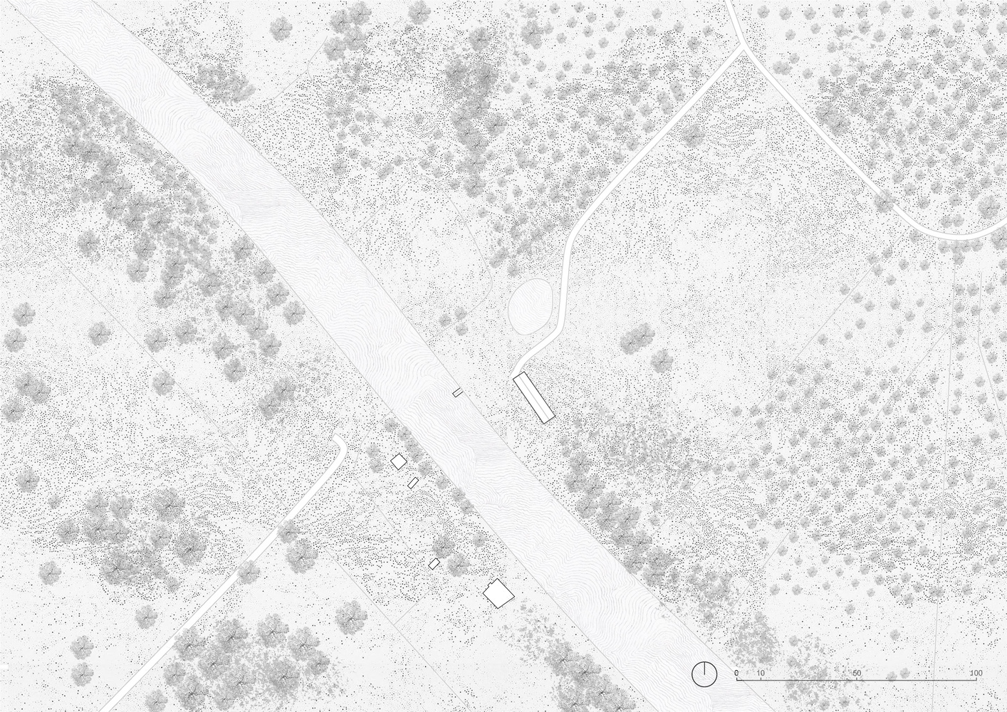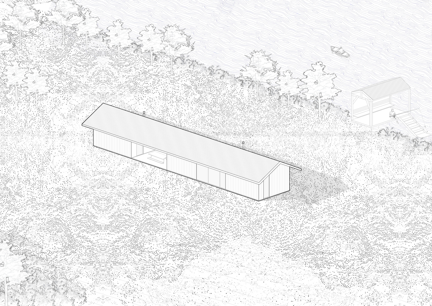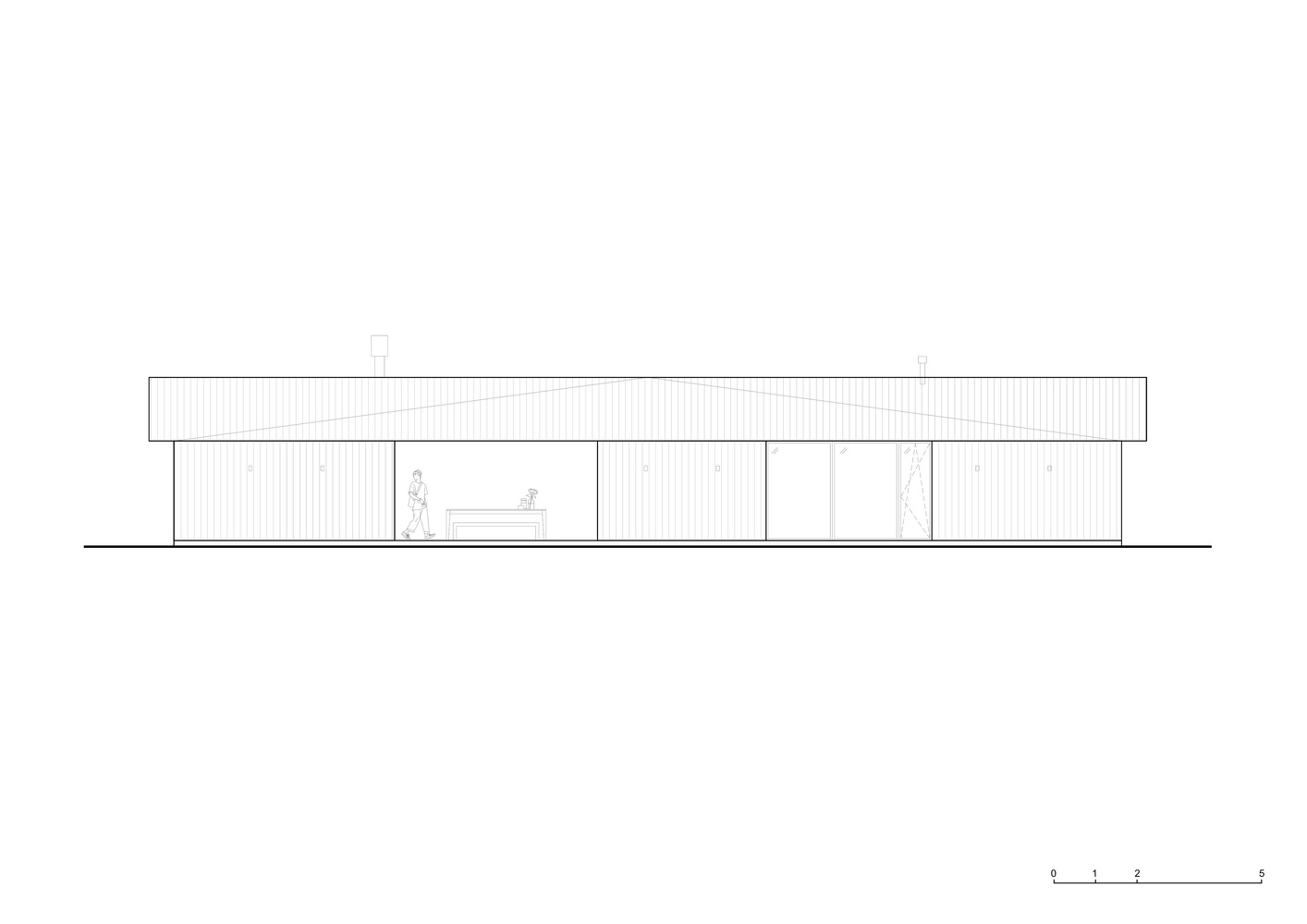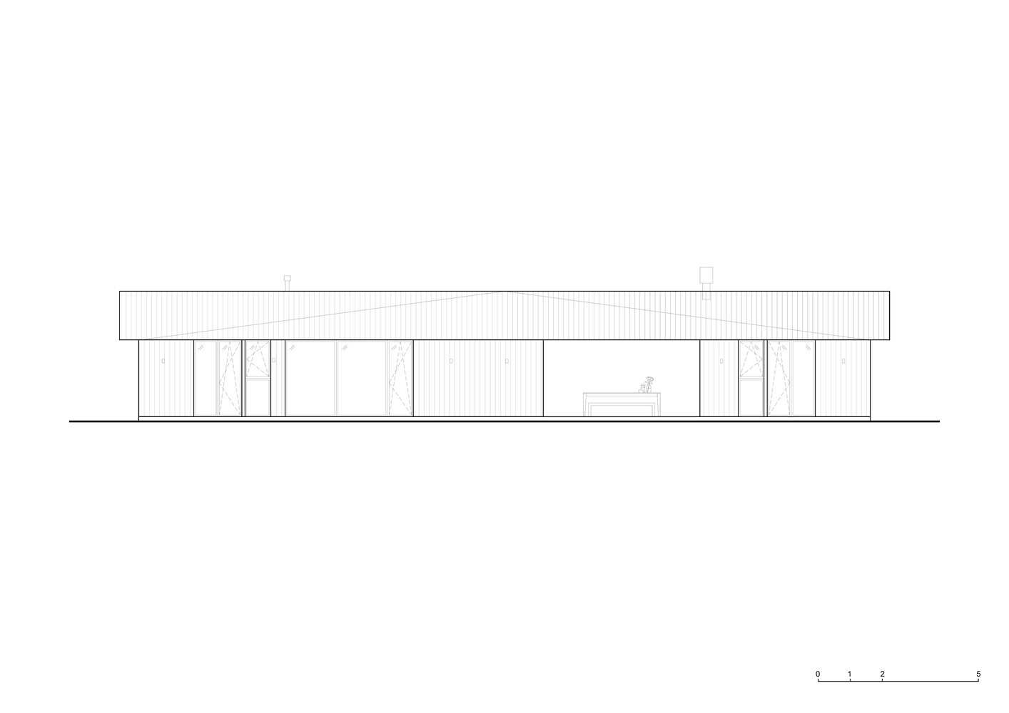 Due to its linear placement and its openness to both fronts, the house frames the landscape and constructs carefully directed scenes towards both the watercourse and the field.