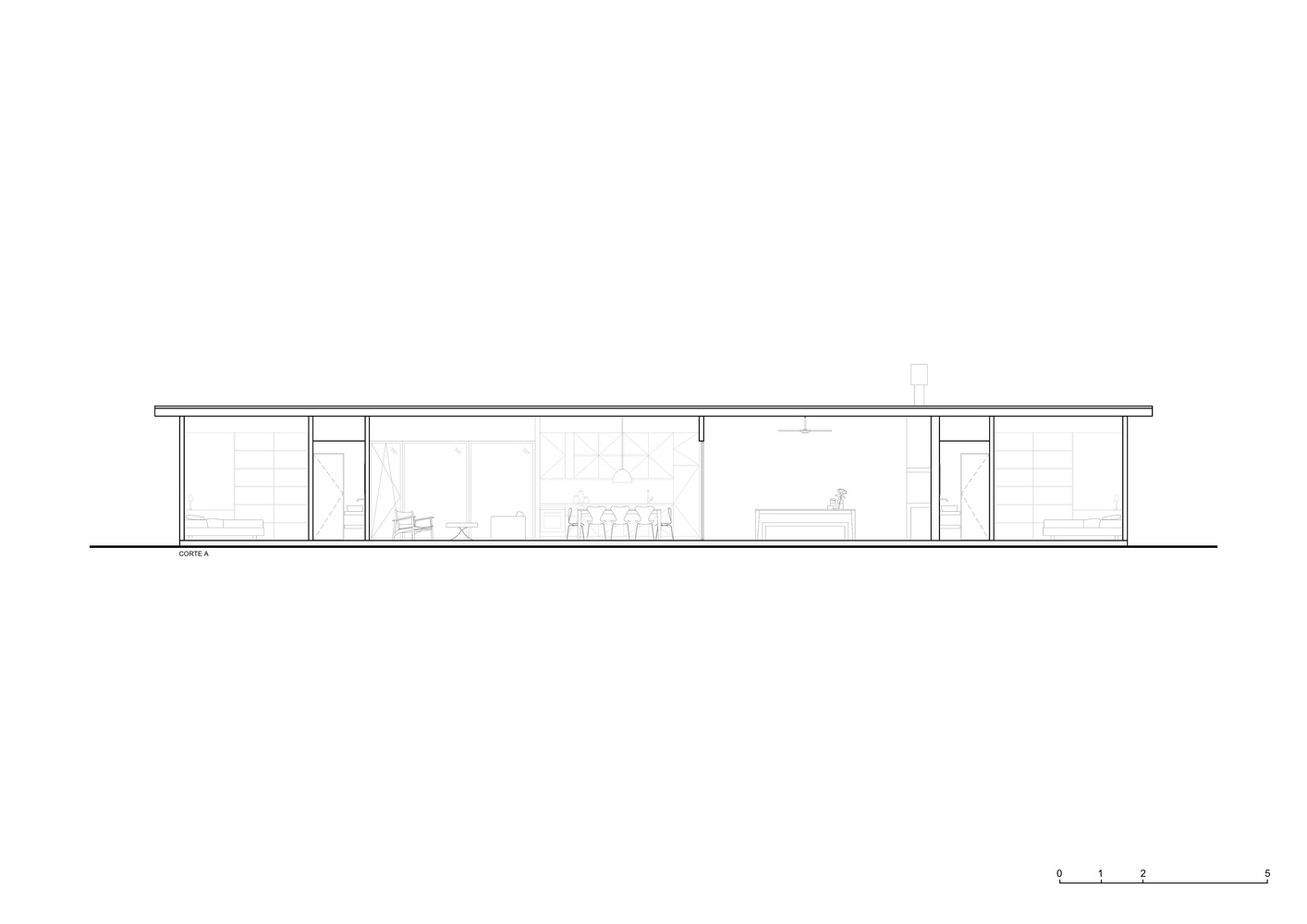 A longitudinal gallery serves as a transition and articulation space, organizing the home into two main areas: