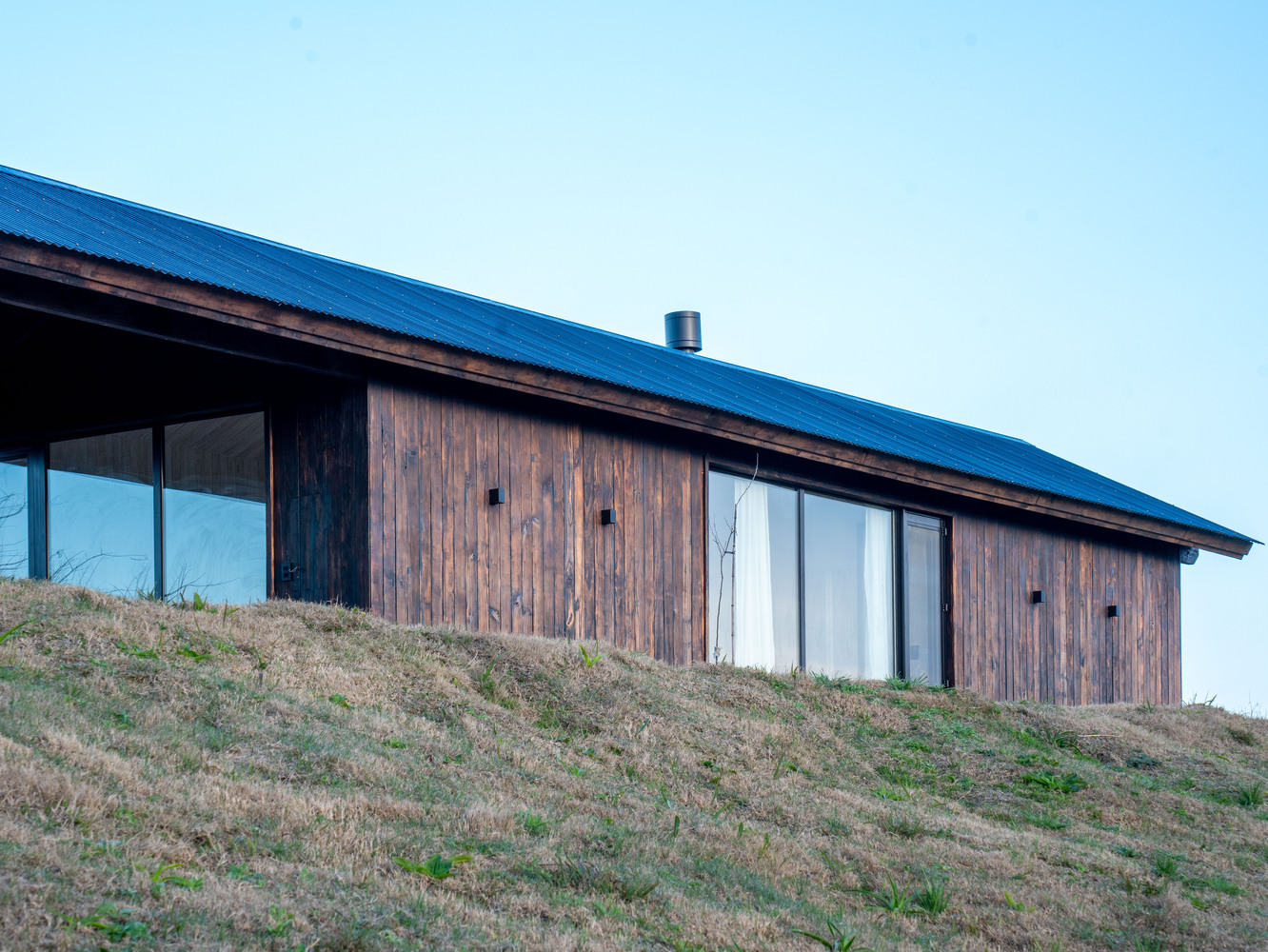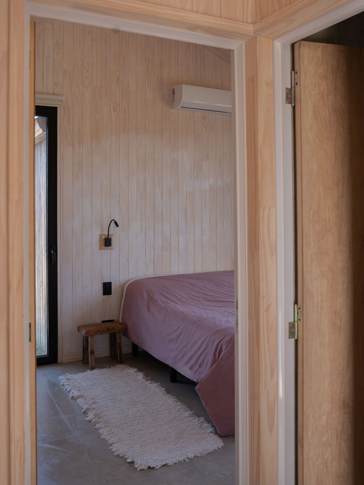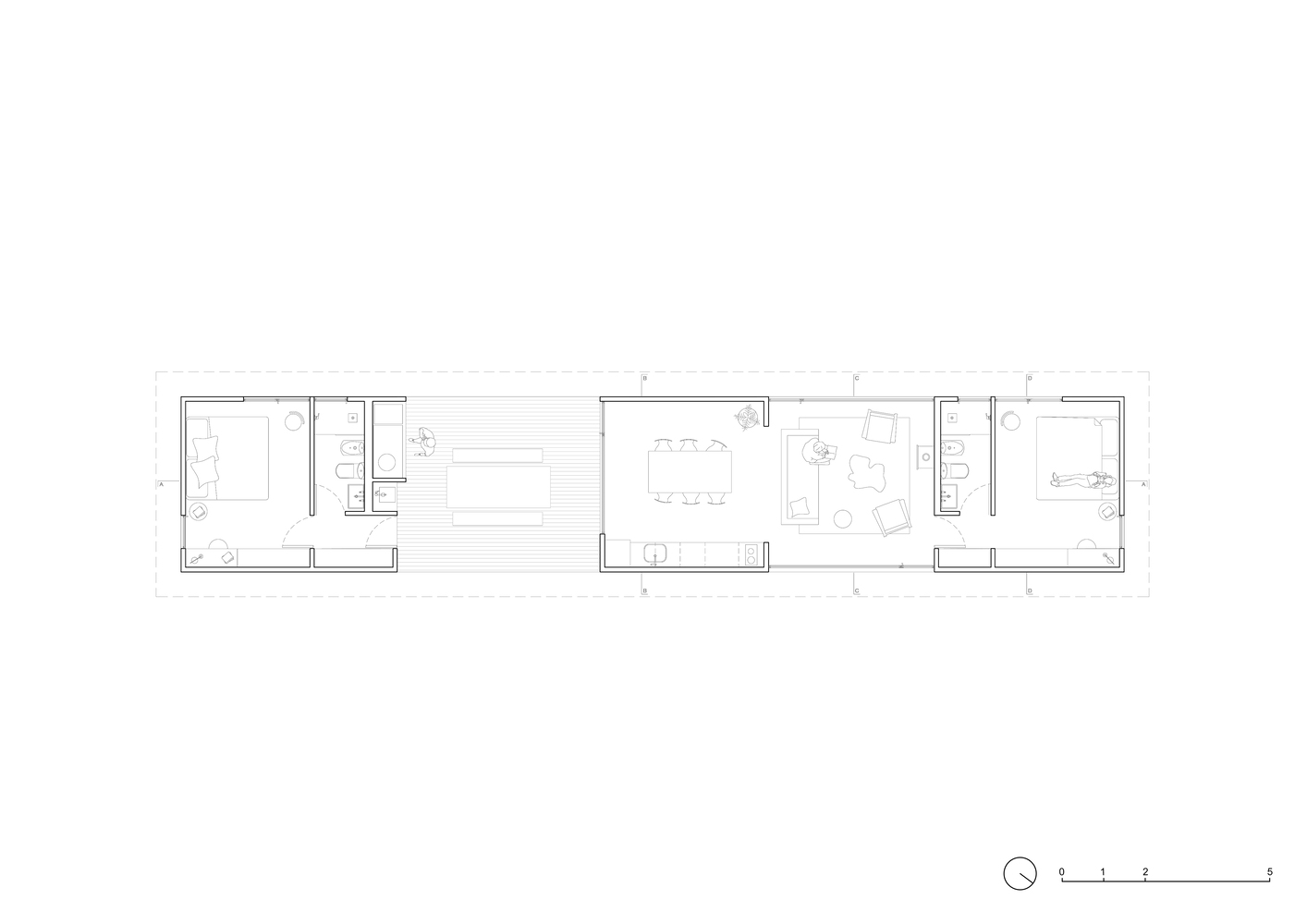 on one side, the domestic core —composed of an integrated kitchen, dining room, living room, and a suite— and on the other, a guest room.