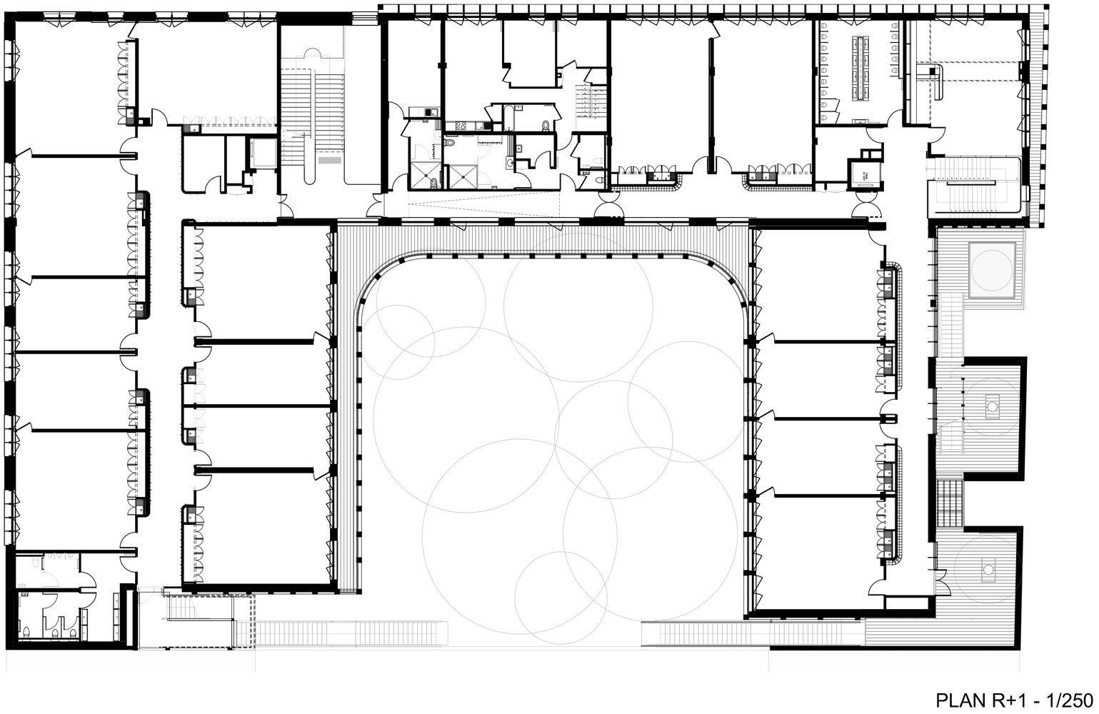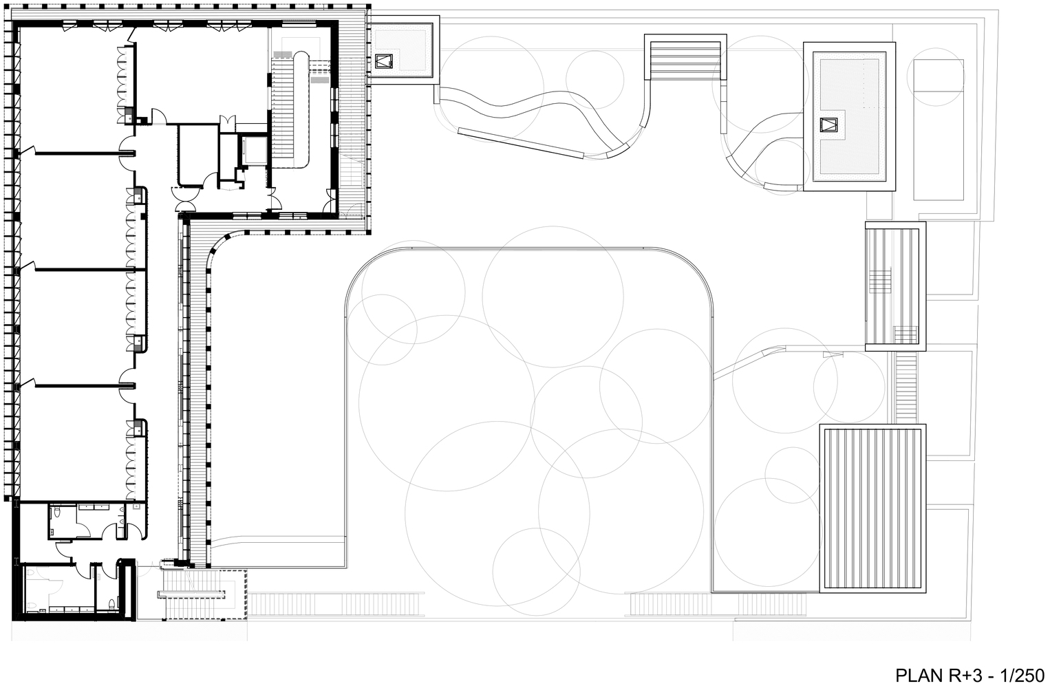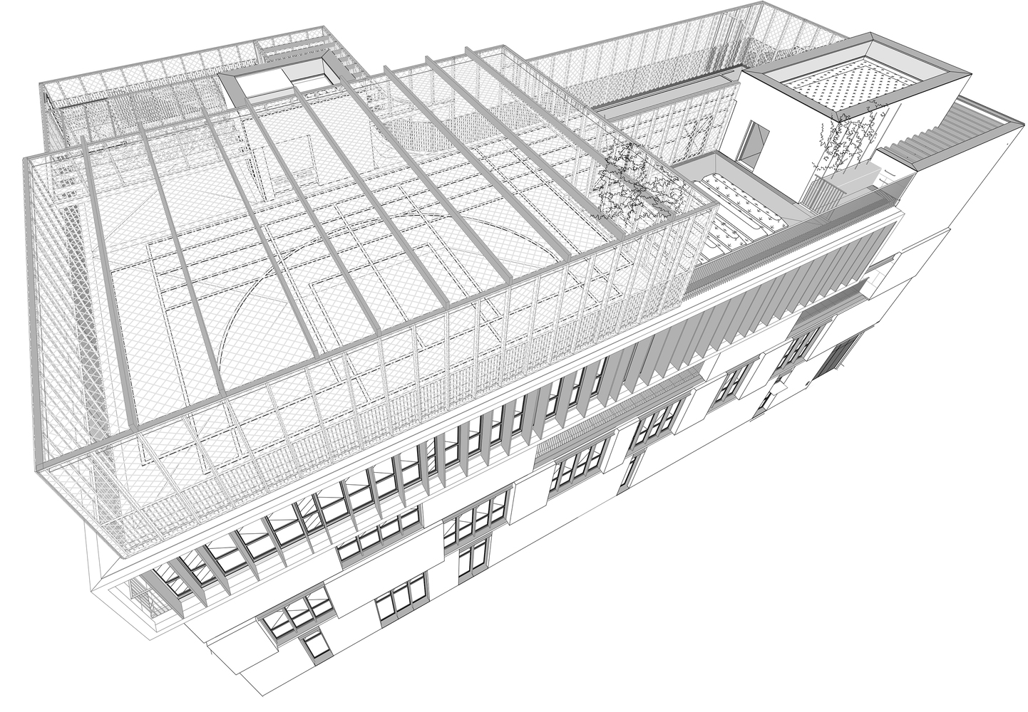 At the request of the City, a rooftop sports facility — half a basketball court, an athletics track, and a catamaran sail-like mesh — completes the program and becomes a true gathering space for the neighborhood.