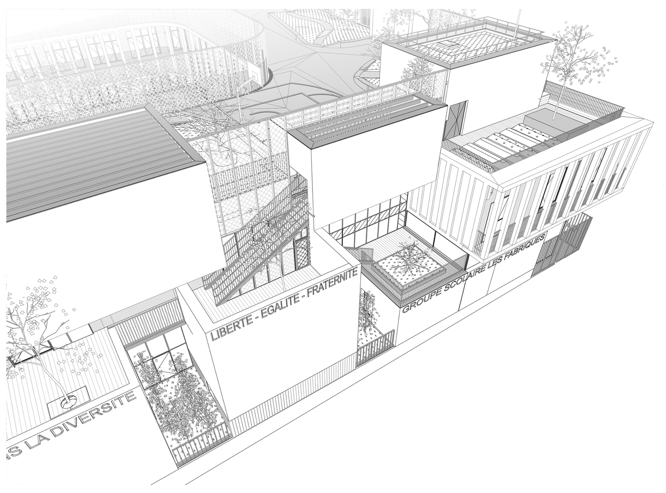 On a highly constrained plot, the agency developed a compact, vertical project, freeing the center of the site for the preschool playground, while the elementary school playgrounds and educational gardens unfold in tiers up to the rooftop.