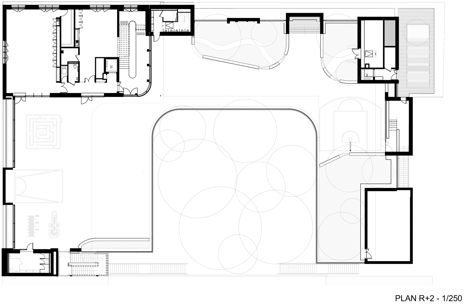 The school is conceived as a "landscape building," an urban cove combining stone, vegetation, and light. A mineral base follows the topography, while massive volumes interlock in an almost cyclopean composition.