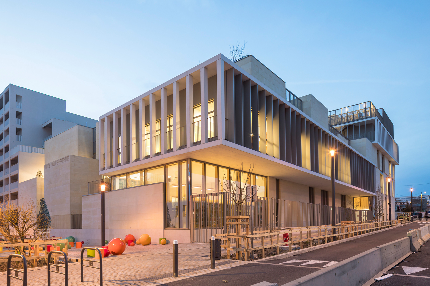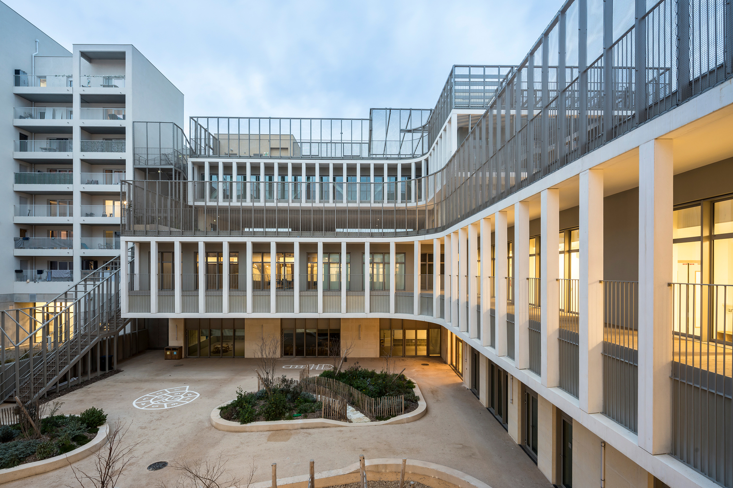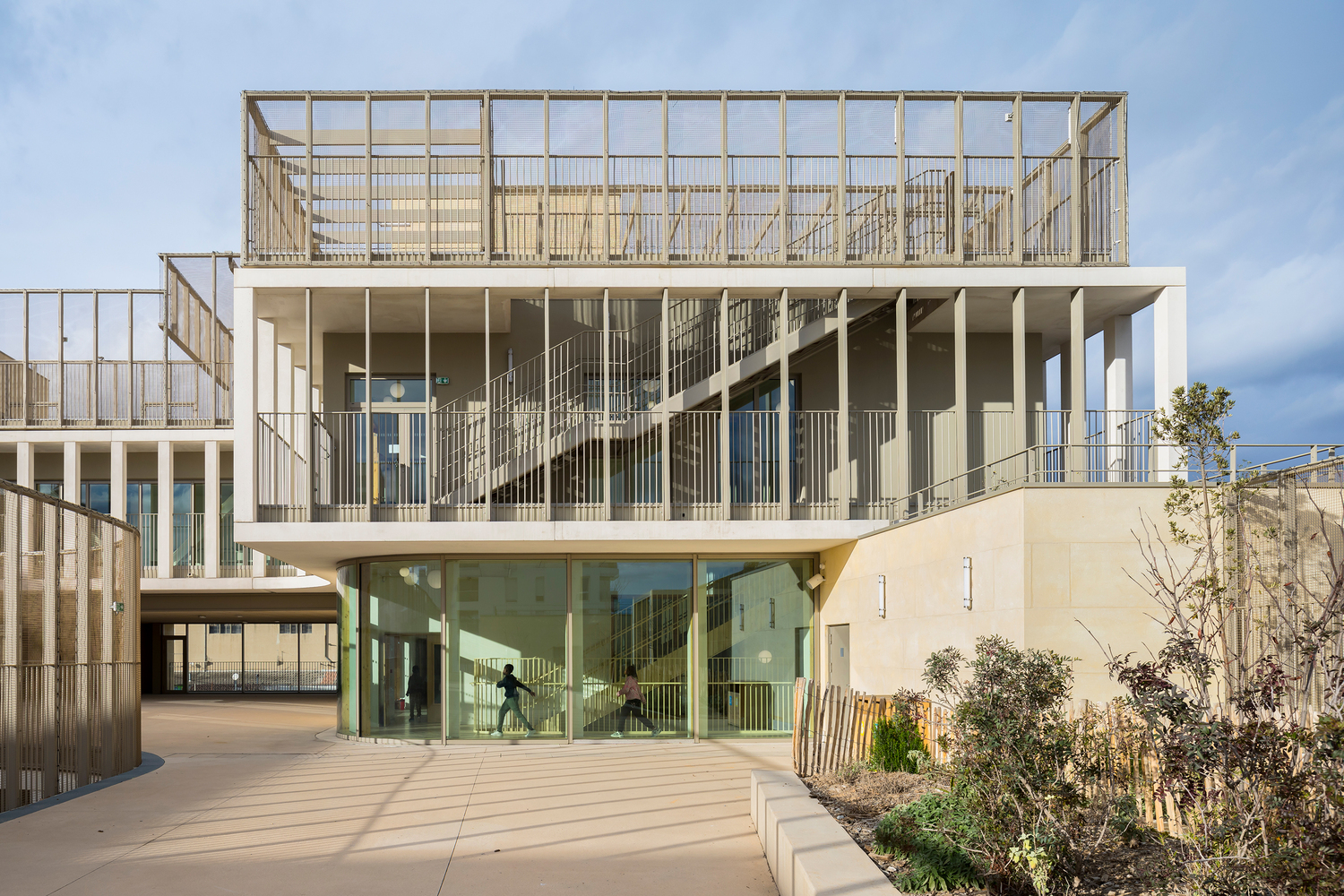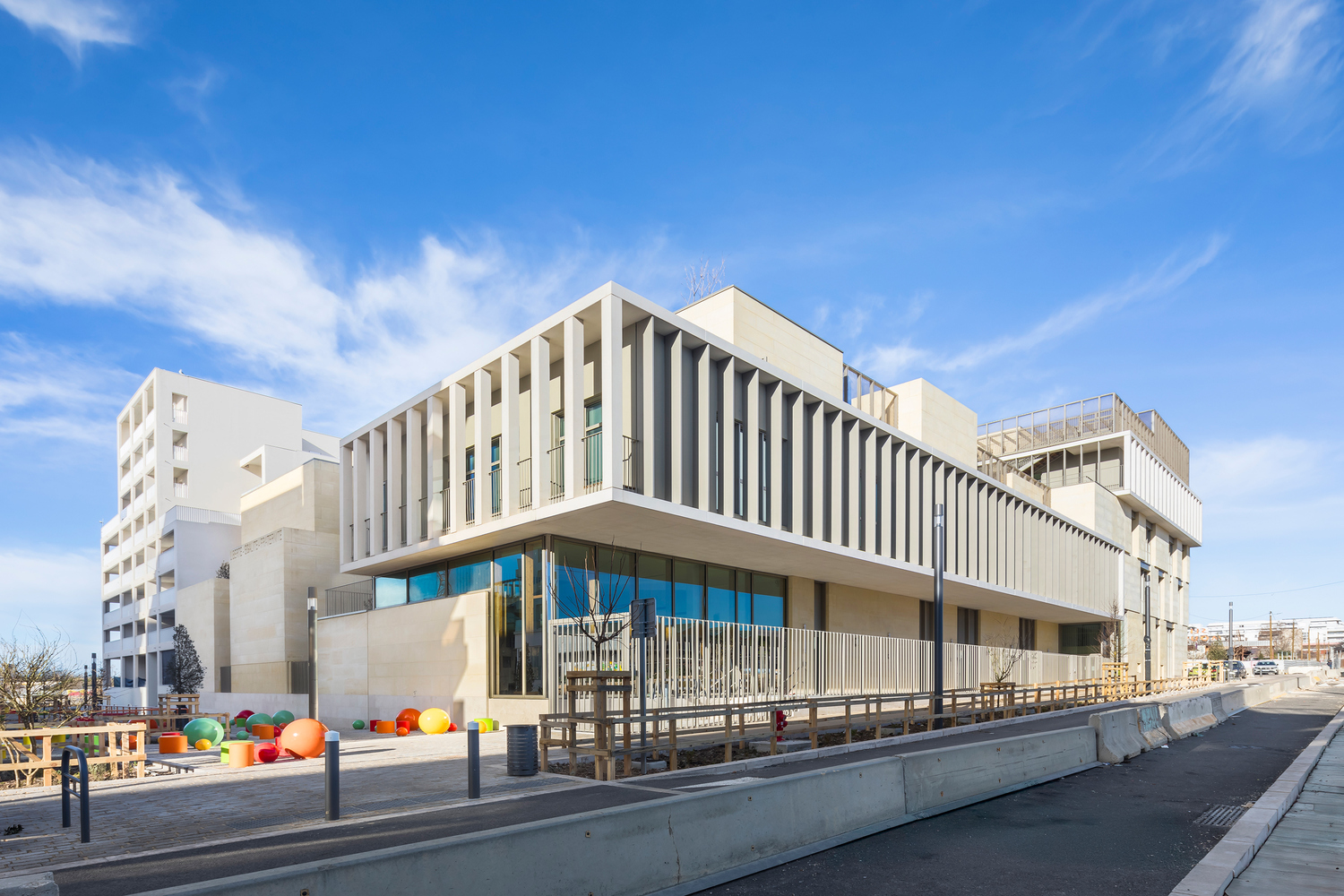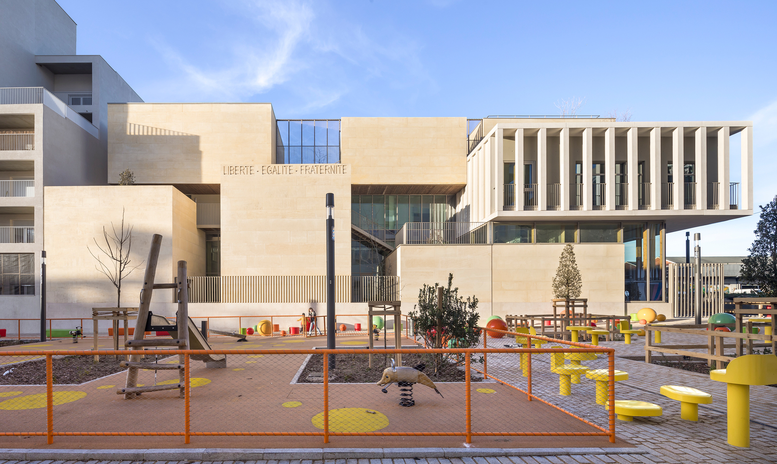 The Les Fabriques school complex, designed by BGA in the heart of Marseille's Littorale urban development zone, brings together a nursery school and an elementary school, each with its own reception areas, circulation spaces, and generously lit and ventilated classrooms.